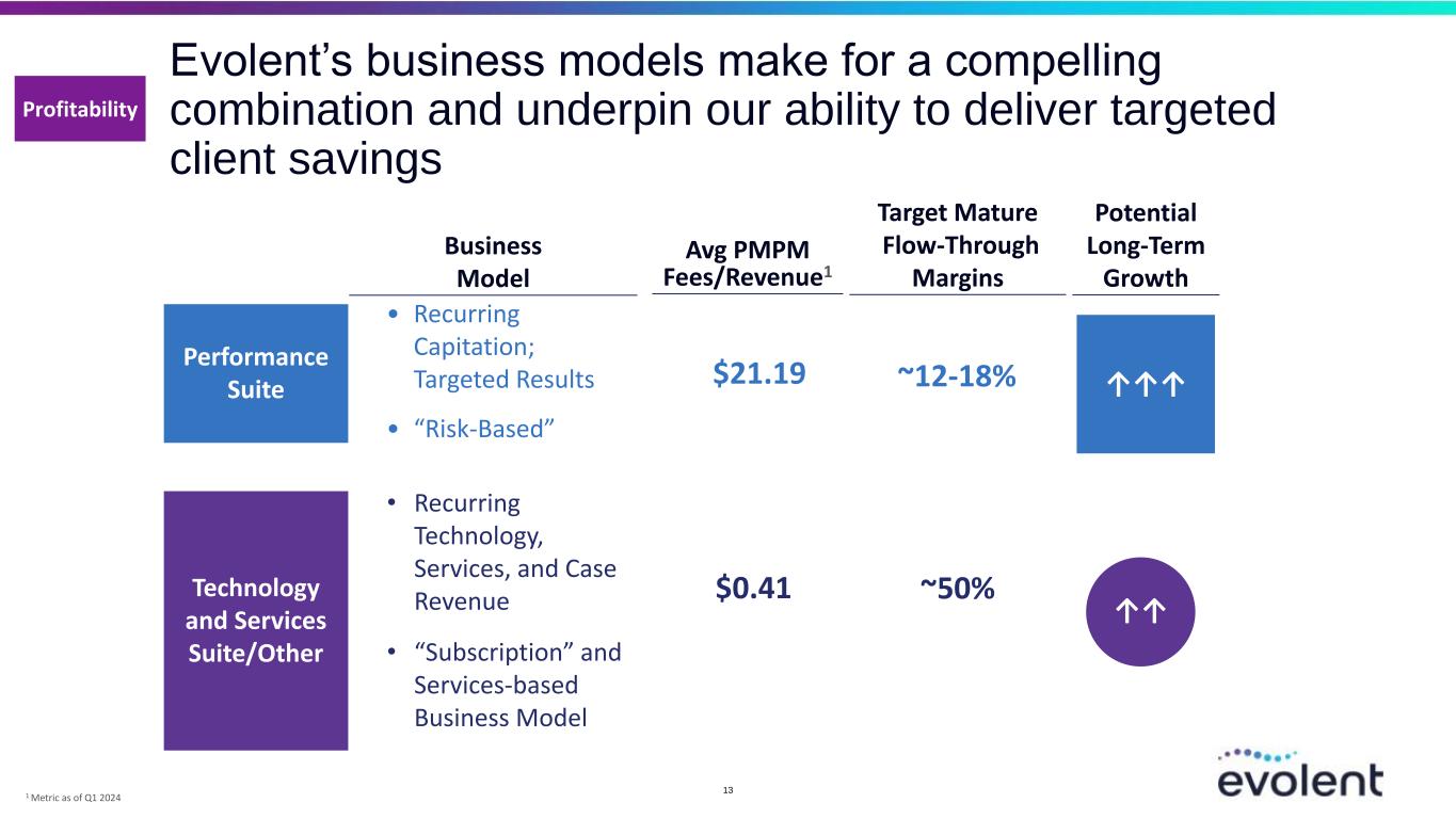 How we calculated product type: PMPM, lives, cases and new revenue agreements Performance Suite Lives on Platform are calculated by summing monthly members covered for specialty care services for contracts not under ASO arrangements, plus members managed by Complex Care in risk arrangements and divided by the number of months in the period. Specialty Technology and Services Suite Lives on Platform are calculated by summing monthly members covered for oncology, cardiology, musculoskeletal, advanced imaging and other diagnostics specialty care services for contracts under ASO arrangements divided by the number of months in the period. Administrative Services Lives on Platform are calculated by summing monthly members covered for administrative services implementation and core performance services divided by the number of months in the period. Cases are calculated by summing the number of individuals receiving services through our surgery management and advanced care planning programs in a given period. Members covered for more than one category are counted in each category. Performance Suite Average PMPM fee is defined as revenue pertaining to our Performance Suite during the period reported divided by Performance Suite Lives on Platform for the period divided by the number of months in the period. Specialty Technology and Services Suite Average PMPM fee is defined as revenue pertaining to the Specialty Technology and Services Suite during the period reported divided by Specialty Technology and Services Suite Lives on Platform for the period divided by the number of months in the period. Administrative Services Average PMPM fee is defined as revenue pertaining to the Administrative Services during the period reported divided by the Administrative Services Lives on Platform for the period divided by the number of months in the period. Revenue per Case is calculated by the revenue pertaining to surgery management and advanced care planning programs divided by the number of cases for a given period. Average Unique Members are calculated by summing members covered by our Performance Suite, Specialty Technology and Services Suite and Administrative Services. In cases where clients cross between multiple products, we only capture members from the product with the maximum number of members. Management uses Lives on Platform, PMPM fees, Cases, Revenue per Case and Average Unique Members because we believe that they provide insight into the unit economics of our services. We believe that these measures are also useful to investors because they allow further insight into the period over period operational performance. Due to our change in segments during the first quarter of 2023, the Company changed its presentation of Lives on Platform to reflect the membership that corresponds to quarterly revenue. The Company recast periods prior to the first quarter of 2023 to reflect the current presentation of Lives on Platform, PMPM fees, Cases and Revenue per Case. The current Performance Suite maps to the prior disclosure of the Clinical Solutions Performance Suite. The current Specialty Technology and Services Suite maps to the prior disclosure of the Clinical Solutions New Century Health Technology and Services Suite. The current Administrative Services maps to the prior disclosure of Evolent Health Services segment. There has been no change in the presentation of Cases from prior period. Operating partner is defined as an individual health plan or provider entity under contract with the Company based on a specific state-level geography and whether a relationship is based on fees for covered lives or capitation per life under management. Certain of our partners operate in a local and highly decentralized manner, requiring negotiation and contracting at a local level to expand into new arrangements and thus may be considered multiple entities under this definition, depending on partner business requirements. Beginning with the first quarter of 2024, Evolent began reporting the number of new revenue agreements signed for Performance Suite, Specialty Technology and Services Suite, Administrative Services and Case-based products. A new revenue agreement includes incremental revenue to the Company reflecting contracts for services to both new partner entities, corporations or health plans as well as additional sales to existing partners. New revenue agreements may include incremental services, geographic, or line of business expansions or a combination thereof. The conversion of Specialty Technology and Services Suite contracts to Performance Suite are also included in this definition. The company does not count renewals for existing scope, growth of membership within an existing contract scope or transaction related purchase agreements, if applicable, in this metric. 24