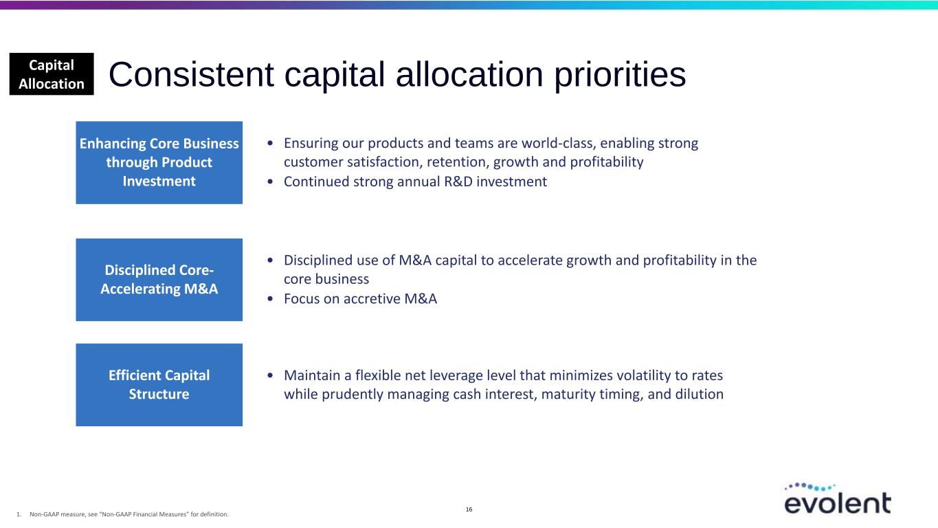 Consistent capital allocation priorities Enhancing Core Business through Product Investment • Ensuring our products and teams are world-class, enabling strong customer satisfaction, retention, growth and profitability • Continued strong annual R&D investment Disciplined Core- Accelerating M&A • Disciplined use of M&A capital to accelerate growth and profitability in the core business • Focus on accretive M&A 1. Non-GAAP measure, see “Non-GAAP Financial Measures” for definition. 16 Efficient Capital Structure • Maintain a flexible net leverage level that minimizes volatility to rates while prudently managing cash interest, maturity timing, and dilution Capital Allocation