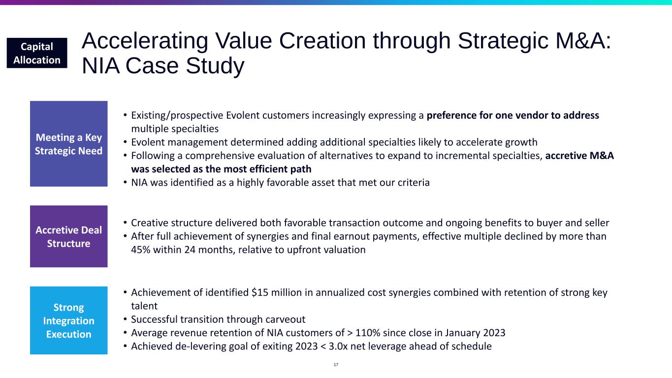Accelerating Value Creation through Strategic M&A: NIA Case Study Meeting a Key Strategic Need • Existing/prospective Evolent customers increasingly expressing a preference for one vendor to address multiple specialties • Evolent management determined adding additional specialties likely to accelerate growth • Following a comprehensive evaluation of alternatives to expand to incremental specialties, accretive M&A was selected as the most efficient path • NIA was identified as a highly favorable asset that met our criteria Accretive Deal Structure • Creative structure delivered both favorable transaction outcome and ongoing benefits to buyer and seller • After full achievement of synergies and final earnout payments, effective multiple declined by more than 45% within 24 months, relative to upfront valuation Strong Integration Execution • Achievement of identified $15 million in annualized cost synergies combined with retention of strong key talent • Successful transition through carveout • Average revenue retention of NIA customers of > 110% since close in January 2023 • Achieved de-levering goal of exiting 2023 < 3.0x net leverage ahead of schedule 17 Capital Allocation