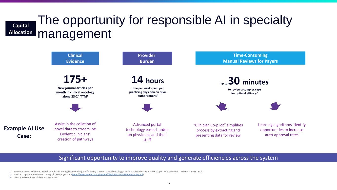 The opportunity for responsible AI in specialty management Provider Burden 14 hours time per week spent per practicing physician on prior authorizations2 Clinical Evidence 175+ New journal articles per month in clinical oncology alone 23-24 TTM1 Time-Consuming Manual Reviews for Payers up to 30 minutes to review a complex case for optimal efficacy3 Example AI Use Case: Significant opportunity to improve quality and generate efficiencies across the system Assist in the collation of novel data to streamline Evolent clinicians’ creation of pathways Advanced portal technology eases burden on physicians and their staff “Clinician Co-pilot” simplifies process by extracting and presenting data for review Learning algorithms identify opportunities to increase auto-approval rates 18 Capital Allocation 1. Evolent Investor Relations. Search of PubMed during last year using the following criteria: “clinical oncology; clinical studies; therapy; narrow scope. Total query on TTM basis = 2,089 results. . 2. AMA 2022 prior authorization survey of 1,001 physicians (https://www.ama-assn.org/system/files/prior-authorization-survey.pdf) 3. Source: Evolent internal data and estimates.