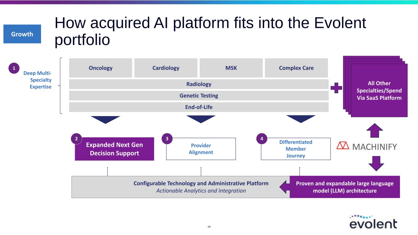 Machinify Auth carveout acquisition accelerates Evolent's product roadmap Machinify Background • Backed by Google Ventures, Battery Ventures, and others • Founded 2016 in Silicon Valley with leading technology and data science expertise • AI platform leveraging healthcare data at scale to drive down costs and improve outcomes • Machinify markets three products – Auth, Pay and Audit – to health plans; 52 million members on platform Key Terms • $25M upfront cash consideration plus up to $7M earnout based on performance • Consideration to be funded out of cash on hand and existing revolving credit facility • Transaction ~breakeven at close; Accretive by Q1 2025 based on efficiency gains • Transaction expected to close in Q3 2024 subject to customary closing conditions Included in the Acquisition • Exclusive, perpetual, royalty-free license to Machinify Auth code and models • Customer contracts with ~$6M in annual SaaS revenue • Select talent expected to join Evolent, including certain developers, data scientists, and account management execs • Entering a long-term services agreement to facilitate strong integration and ongoing service to customers + MACHINIFY Auth Capital Allocation