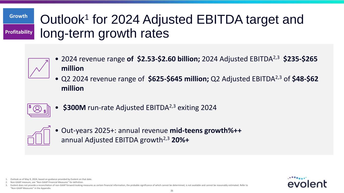 Non-GAAP Financial Measures The Company views the following activities as integral to understanding its non-GAAP financial measures: • Repositioning costs include severance, termination benefits and related payroll taxes of $1.8 million, dedicated employee costs of $1.2 million, third-party professional services of $3.5 million and office space consolidation costs of $3.5 million for the three months ended March 31, 2024, respectively. Repositioning costs are not part of Evolent’s normal course of business and are incurred when there is a business reason to enact a repositioning plan. Adjusting for these costs gives a better view of the Evolent’s normal operating costs. We only adjust costs that (i) are included within selling, general and administrative expenses on the consolidated statement of operations, (ii) meet the criteria outlined within the respective repositioning plan and (iii) do not relate to normal business operations or ongoing activities. o Dedicated employee costs primarily include project management and technology staff costs needed to migrate acquired businesses to Evolent’s integrated technology platform and costs related to the consolidation of internal operations, strategies, processes and platforms. Dedicated employee costs are limited to employees that will have no role in ongoing operations and have no planned role at Evolent once the repositioning activities are completed. o Professional services costs primarily relate to services provided by a third-party vendor to review our operating model and organizational design in order to improve our profitability, create value through our solutions and invest in strategic opportunities in future periods. o Office space consolidation costs include early termination penalties and associated expenses. • Acquisition-related costs include but are not limited to integration consultants, financial advisory and banking services, external valuation and accounting advisory services, legal fees and transaction bonuses paid to certain employees. • Purchase accounting adjustments include amortization expense on intangible assets such as corporate trade names, customer, relationships, provider network contracts and existing technology related to acquisitions and business combinations. We believe it is important for the reader to understand that revenue generated from acquisitions is included within revenue in calculating adjusted income to common shareholders however amortization expense from acquired intangible assets is excluded in determining adjusted income to common shareholders because it does not directly relate to the services performed for the Company’s customers. In addition to disclosing financial results that are determined in accordance with GAAP, we present and discuss certain non-GAAP financial measures, as supplemental measures to help investors evaluate our fundamental operational performance. Revenue Excluding Divested Assets is defined as the sum of revenue less revenue from our divested health plan assets. Management uses Revenue Excluding Divested Assets as a supplemental performance measure because it reflects our on-going operational results. The measures is useful to investors because it reflects the full view of our operational performance in line with how we generate our long-term forecasts. Net Debt is defined as the carrying value outstanding under the Company’s 2025 Notes, 2029 Notes and Credit Facilities adjusted to exclude the impact of net discounts and deferred financing costs less Available Cash. Management uses Net Debt as a supplemental performance measure because the netting of cash and cash equivalents from the principal amount of debt outstanding allows us to determine our debt repayment requirements in excess of available cash. We believe that this measure is also useful to investors because it allows further insight into the capital requirements of the Company that is comparable to other organizations in our industry and in the market in general. Net Debt to LTM Adjusted EBITDA is defined as Net Debt divided by the sum of the Company's LTM Adjusted EBITDA. Management uses Net Debt to LTM Adjusted EBITDA as a supplemental performance measure because it allows the investor to understand capital requirements compared to operating performance over time. We believe that this measure is also useful to investors because it allows further insight into the period over period operational performance in a manner that is comparable to other organizations in our industry and in the market in general. Available Cash is defined as cash and cash equivalents determined in accordance with GAAP adjusted to exclude cash and cash equivalents held at Passport Health Plan. Management uses Available Cash a supplemental performance measure as it excludes cash held by Passport that is not readily accessible for expenditures outside of the Passport corporate entity without regulatory approval from the Kentucky Department of Insurance. Cash Generation is defined as cash flow excluding interest, dividends, debt prepayments, and other financing costs. Adjusted EBITDA is defined as net loss attributable to common shareholders of Evolent Health, Inc. before interest income, interest expense, benefit from (provision for) income taxes, depreciation and amortization expenses, adjusted to exclude impairment of equity method investments, gain on transfer of membership, change in the tax receivable agreement liability, loss on repayment/extinguishment of debt, net, goodwill impairment, gain from equity method investees, change in fair value of contingent consideration, other income (expense), loss on disposal of non-strategic assets, right-of-use assets impairment, repositioning costs, stock-based compensation expense, severance costs, amortization of contract cost assets, strategy and shareholder advisory services, dividends and accretion on Series A Preferred Stock, acquisition-related costs and loss from discont