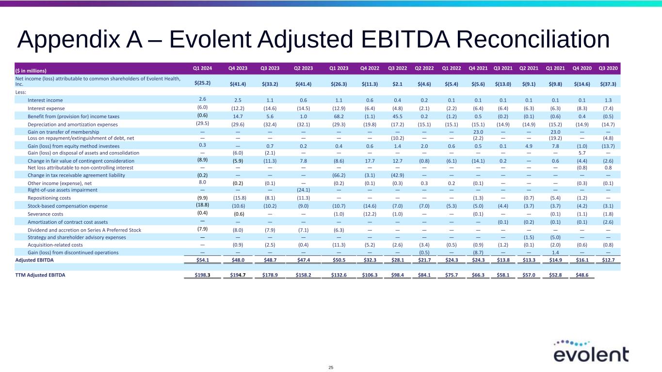 Appendix A – Evolent Adjusted EBITDA Reconciliation ($ in millions) Q1 2024 Q4 2023 Q3 2023 Q2 2023 Q1 2023 Q4 2022 Q3 2022 Q2 2022 Q1 2022 Q4 2021 Q3 2021 Q2 2021 Q1 2021 Q4 2020 Q3 2020 Net income (loss) attributable to common shareholders of Evolent Health, Inc. $(25.2) $(41.4) $(33.2) $(41.4) $(26.3) $(11.3) $2.1 $(4.6) $(5.4) $(5.6) $(13.0) $(9.1) $(9.8) $(14.6) $(37.3) Less: Interest income 2.6 2.5 1.1 0.6 1.1 0.6 0.4 0.2 0.1 0.1 0.1 0.1 0.1 0.1 1.3 Interest expense (6.0) (12.2) (14.6) (14.5) (12.9) (6.4) (4.8) (2.1) (2.2) (6.4) (6.4) (6.3) (6.3) (8.3) (7.4) Benefit from (provision for) income taxes (0.6) 14.7 5.6 1.0 68.2 (1.1) 45.5 0.2 (1.2) 0.5 (0.2) (0.1) (0.6) 0.4 (0.5) Depreciation and amortization expenses (29.5) (29.6) (32.4) (32.1) (29.3) (19.8) (17.2) (15.1) (15.1) (15.1) (14.9) (14.9) (15.2) (14.9) (14.7) Gain on transfer of membership — — — — — — — — — 23.0 — — 23.0 — — Loss on repayment/extinguishment of debt, net — — — — — — (10.2) — — (2.2) — — (19.2) — (4.8) Gain (loss) from equity method investees 0.3 — 0.7 0.2 0.4 0.6 1.4 2.0 0.6 0.5 0.1 4.9 7.8 (1.0) (13.7) Gain (loss) on disposal of assets and consolidation — (6.0) (2.1) — — — — — — — — — — 5.7 — Change in fair value of contingent consideration (8.9) (5.9) (11.3) 7.8 (8.6) 17.7 12.7 (0.8) (6.1) (14.1) 0.2 — 0.6 (4.4) (2.6) Net loss attributable to non-controlling interest — — — — — — — — — — — — — (0.8) 0.8 Change in tax receivable agreement liability (0.2) — — — (66.2) (3.1) (42.9) — — — — — — — — Other income (expense), net 8.0 (0.2) (0.1) — (0.2) (0.1) (0.3) 0.3 0.2 (0.1) — — — (0.3) (0.1) Right-of-use assets impairment — — — (24.1) — — — — — — — — — — — Repositioning costs (9.9) (15.8) (8.1) (11.3) — — — — — (1.3) — (0.7) (5.4) (1.2) — Stock-based compensation expense (18.8) (10.6) (10.2) (9.0) (10.7) (14.6) (7.0) (7.0) (5.3) (5.0) (4.4) (3.7) (3.7) (4.2) (3.1) Severance costs (0.4) (0.6) — — (1.0) (12.2) (1.0) — — (0.1) — — (0.1) (1.1) (1.8) Amortization of contract cost assets — — — — — — — — — — (0.1) (0.2) (0.1) (0.1) (2.6) Dividend and accretion on Series A Preferred Stock (7.9) (8.0) (7.9) (7.1) (6.3) — — — — — — — — — — Strategy and shareholder advisory expenses — — — — — — — — — — — (1.5) (5.0) — — Acquisition-related costs — (0.9) (2.5) (0.4) (11.3) (5.2) (2.6) (3.4) (0.5) (0.9) (1.2) (0.1) (2.0) (0.6) (0.8) Gain (loss) from discontinued operations — — — — — — — (0.5) — (8.7) — — 1.4 — — Adjusted EBITDA $54.1 $48.0 $48.7 $47.4 $50.5 $32.3 $28.1 $21.7 $24.3 $24.3 $13.8 $13.3 $14.9 $16.1 $12.7 TTM Adjusted EBITDA $198.3 $194.7 $178.9 $158.2 $132.6 $106.3 $98.4 $84.1 $75.7 $66.3 $58.1 $57.0 $52.8 $48.6 25