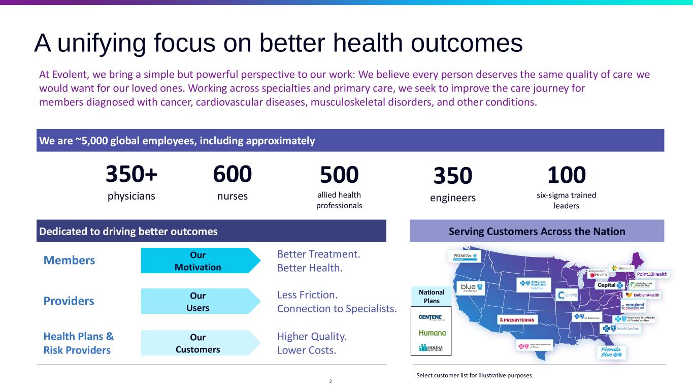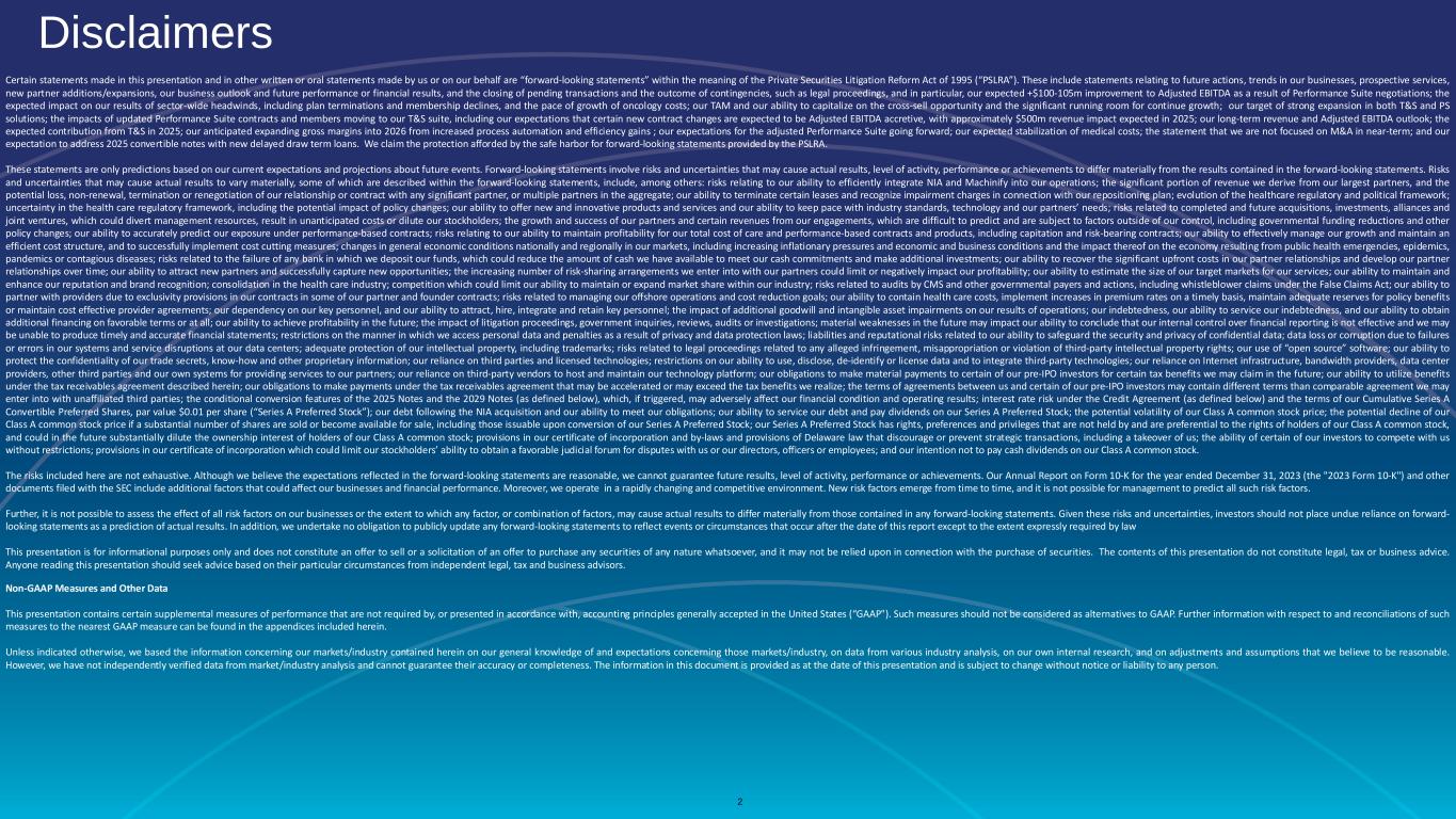 Disclaimers 2 Certain statements made in this presentation and in other written or oral statements made by us or on our behalf are “forward-looking statements” within the meaning of the Private Securities Litigation Reform Act of 1995 (“PSLRA”). These include statements relating to future actions, trends in our businesses, prospective services, new partner additions/expansions, our business outlook and future performance or financial results, and the closing of pending transactions and the outcome of contingencies, such as legal proceedings, and in particular, our expected +$100-105m improvement to Adjusted EBITDA as a result of Performance Suite negotiations; the expected impact on our results of sector-wide headwinds, including plan terminations and membership declines, and the pace of growth of oncology costs; our TAM and our ability to capitalize on the cross-sell opportunity and the significant running room for continue growth; our target of strong expansion in both T&S and PS solutions; the impacts of updated Performance Suite contracts and members moving to our T&S suite, including our expectations that certain new contract changes are expected to be Adjusted EBITDA accretive, with approximately $500m revenue impact expected in 2025; our long-term revenue and Adjusted EBITDA outlook; the expected contribution from T&S in 2025; our anticipated expanding gross margins into 2026 from increased process automation and efficiency gains ; our expectations for the adjusted Performance Suite going forward; our expected stabilization of medical costs; the statement that we are not focused on M&A in near-term; and our expectation to address 2025 convertible notes with new delayed draw term loans. We claim the protection afforded by the safe harbor for forward-looking statements provided by the PSLRA. These statements are only predictions based on our current expectations and projections about future events. Forward-looking statements involve risks and uncertainties that may cause actual results, level of activity, performance or achievements to differ materially from the results contained in the forward-looking statements. Risks and uncertainties that may cause actual results to vary materially, some of which are described within the forward-looking statements, include, among others: risks relating to our ability to efficiently integrate NIA and Machinify into our operations; the significant portion of revenue we derive from our largest partners, and the potential loss, non-renewal, termination or renegotiation of our relationship or contract with any significant partner, or multiple partners in the aggregate; our ability to terminate certain leases and recognize impairment charges in connection with our repositioning plan; evolution of the healthcare regulatory and political framework; uncertainty in the health care regulatory framework, including the potential impact of policy changes; our ability to offer new and innovative products and services and our ability to keep pace with industry standards, technology and our partners’ needs; risks related to completed and future acquisitions, investments, alliances and joint ventures, which could divert management resources, result in unanticipated costs or dilute our stockholders; the growth and success of our partners and certain revenues from our engagements, which are difficult to predict and are subject to factors outside of our control, including governmental funding reductions and other policy changes; our ability to accurately predict our exposure under performance-based contracts; risks relating to our ability to maintain profitability for our total cost of care and performance-based contracts and products, including capitation and risk-bearing contracts; our ability to effectively manage our growth and maintain an efficient cost structure, and to successfully implement cost cutting measures; changes in general economic conditions nationally and regionally in our markets, including increasing inflationary pressures and economic and business conditions and the impact thereof on the economy resulting from public health emergencies, epidemics, pandemics or contagious diseases; risks related to the failure of any bank in which we deposit our funds, which could reduce the amount of cash we have available to meet our cash commitments and make additional investments; our ability to recover the significant upfront costs in our partner relationships and develop our partner relationships over time; our ability to attract new partners and successfully capture new opportunities; the increasing number of risk-sharing arrangements we enter into with our partners could limit or negatively impact our profitability; our ability to estimate the size of our target markets for our services; our ability to maintain and enhance our reputation and brand recognition; consolidation in the health care industry; competition which could limit our ability to maintain or expand market share within our industry; risks related to audits by CMS and other governmental payers and actions, including whistleblower claims under the False Claims Act; our ability to partner with providers due to exclusivity provisions in our contracts in some of our partner and founder contracts; risks related to managing our offshore operations and cost reduction goals; our ability to contain health care costs, implement increases in premium rates on a timely basis, maintain adequate reserves for policy benefits or maintain cost effective provider agreements; our dependency on our key personnel, and our ability to attract, hire, integrate and retain key personnel; the impact of additional goodwill and intangible asset impairments on our results of operations; our indebtedness, our ability to service our indebtedness, and our ability to obtain additional financing on favorable terms or at all; our ability to achieve profitability in the future; the impact of litigation proceedings, g
