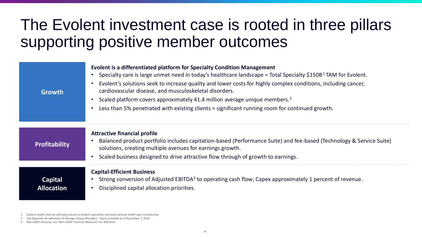 A unifying focus on better health outcomes Members Our Motivation Better Treatment. Better Health. Serving Customers Across the Nation 3 At Evolent, we bring a simple but powerful perspective to our work: We believe every person deserves the same quality of care we would want for our loved ones. Working across specialties and primary care, we seek to improve the care journey for members diagnosed with cancer, cardiovascular diseases, musculoskeletal disorders, and other conditions. Dedicated to driving better outcomes Providers Our Users Less Friction. Connection to Specialists. Health Plans & Risk Providers Our Customers Higher Quality. Lower Costs. We are ~5,000 global employees, including approximately 350+ physicians 350 engineers 100 six-sigma trained leaders 600 nurses 500 allied health professionals OH NC SC PA Select customer list for illustrative purposes. National Plans