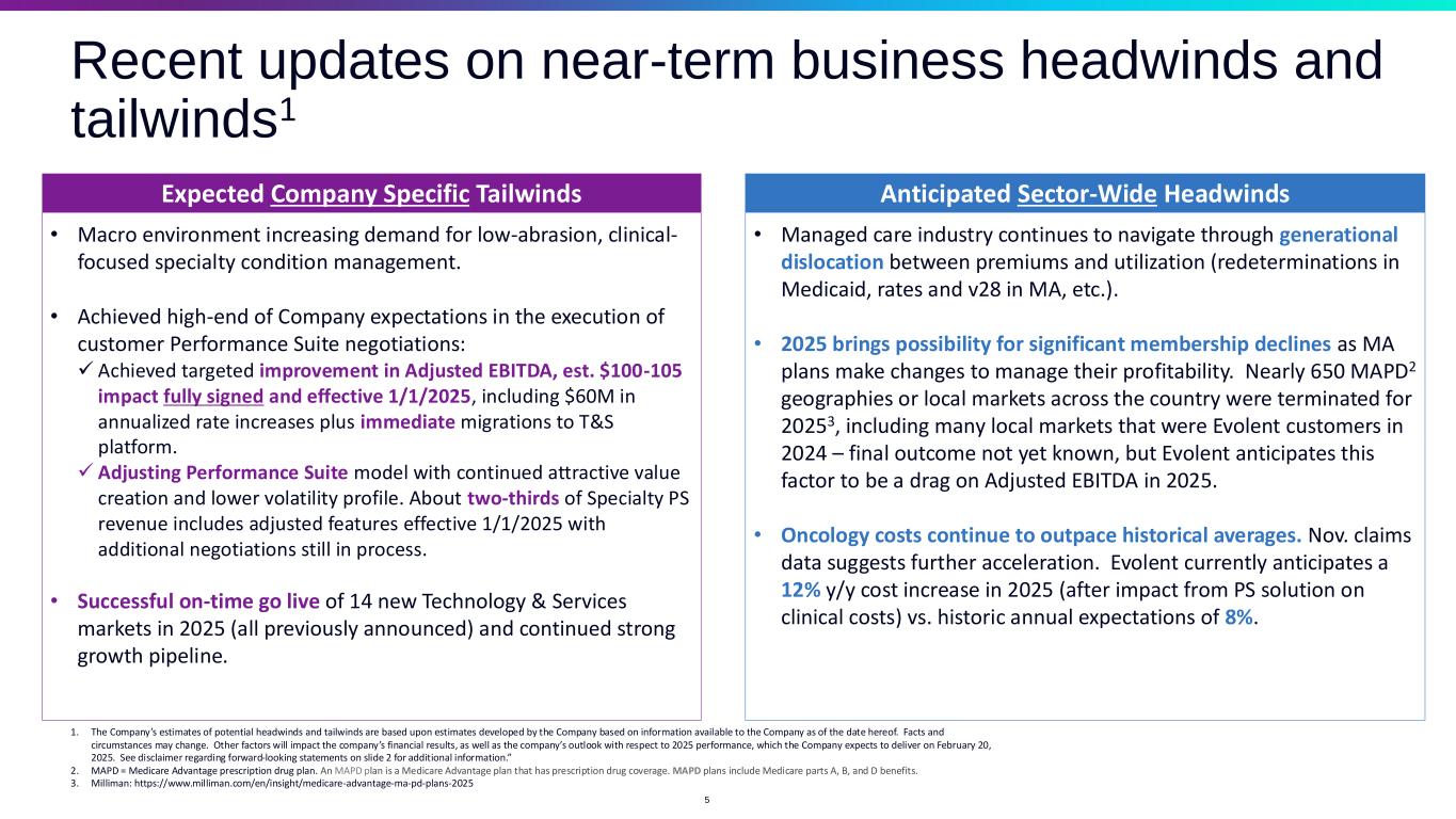 Evolent is a differentiated platform for Specialty Condition Management • Specialty care is large unmet need in today’s healthcare landscape = Total Specialty $150B1 TAM for Evolent. • Evolent’s solutions seek to increase quality and lower costs for highly complex conditions, including cancer, cardiovascular disease, and musculoskeletal disorders. • Scaled platform covers approximately 41.4 million average unique members.2 • Less than 5% penetrated with existing clients = significant running room for continued growth. The Evolent investment case is rooted in three pillars supporting positive member outcomes Growth Profitability Capital Allocation 1. Evolent Health internal estimates based on Evolent specialties and total national health plan membership. 2. See Appendix for definition of Average Unique Members. Figure provided as of November 7, 2024. 3. Non-GAAP measure, see “Non-GAAP Financial Measures” for definition. 4 Attractive financial profile • Balanced product portfolio includes capitation-based (Performance Suite) and fee-based (Technology & Service Suite) solutions, creating multiple avenues for earnings growth. • Scaled business designed to drive attractive flow through of growth to earnings. Capital-Efficient Business • Strong conversion of Adjusted EBITDA3 to operating cash flow; Capex approximately 1 percent of revenue. • Disciplined capital allocation priorities.