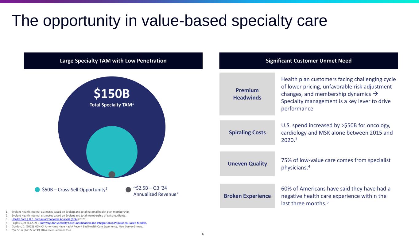 Recent updates on near-term business headwinds and tailwinds1 Expected Company Specific Tailwinds Anticipated Sector-Wide Headwinds • Macro environment increasing demand for low-abrasion, clinical- focused specialty condition management. • Achieved high-end of Company expectations in the execution of customer Performance Suite negotiations: ✓ Achieved targeted improvement in Adjusted EBITDA, est. $100-105 impact fully signed and effective 1/1/2025, including $60M in annualized rate increases plus immediate migrations to T&S platform. ✓ Adjusting Performance Suite model with continued attractive value creation and lower volatility profile. About two-thirds of Specialty PS revenue includes adjusted features effective 1/1/2025 with additional negotiations still in process. • Successful on-time go live of 14 new Technology & Services markets in 2025 (all previously announced) and continued strong growth pipeline. • Managed care industry continues to navigate through generational dislocation between premiums and utilization (redeterminations in Medicaid, rates and v28 in MA, etc.). • 2025 brings possibility for significant membership declines as MA plans make changes to manage their profitability. Nearly 650 MAPD2 geographies or local markets across the country were terminated for 20253, including many local markets that were Evolent customers in 2024 – final outcome not yet known, but Evolent anticipates this factor to be a drag on Adjusted EBITDA in 2025. • Oncology costs continue to outpace historical averages. Nov. claims data suggests further acceleration. Evolent currently anticipates a 12% y/y cost increase in 2025 (after impact from PS solution on clinical costs) vs. historic annual expectations of 8%. 1. The Company’s estimates of potential headwinds and tailwinds are based upon estimates developed by the Company based on information available to the Company as of the date hereof. Facts and circumstances may change. Other factors will impact the company’s financial results, as well as the company’s outlook with respect to 2025 performance, which the Company expects to deliver on February 20, 2025. See disclaimer regarding forward-looking statements on slide 2 for additional information.” 2. MAPD = Medicare Advantage prescription drug plan. An MAPD plan is a Medicare Advantage plan that has prescription drug coverage. MAPD plans include Medicare parts A, B, and D benefits. 3. Milliman: https://www.milliman.com/en/insight/medicare-advantage-ma-pd-plans-2025 5