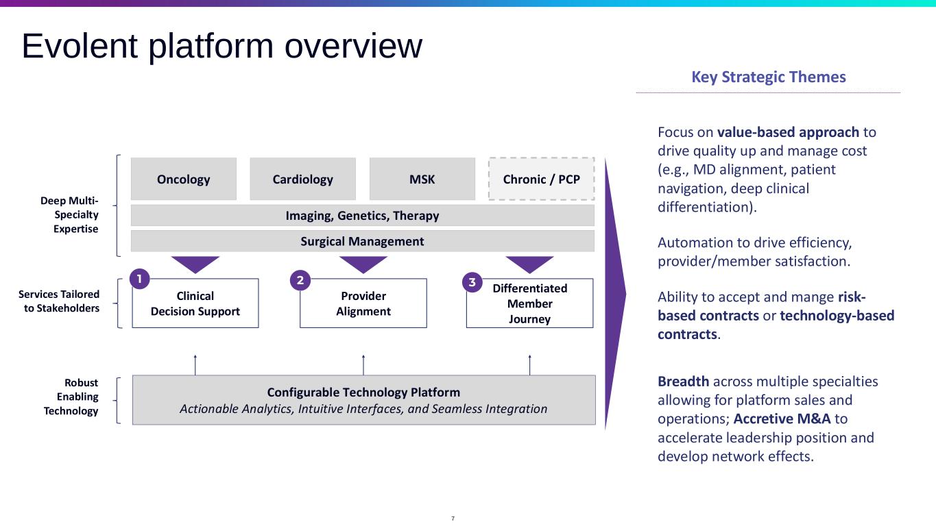 The opportunity in value-based specialty care Large Specialty TAM with Low Penetration Significant Customer Unmet Need Uneven Quality Spiraling Costs Broken Experience U.S. spend increased by >$50B for oncology, cardiology and MSK alone between 2015 and 2020.3 75% of low-value care comes from specialist physicians.4 60% of Americans have said they have had a negative health care experience within the last three months.5 $150B Total Specialty TAM1 $50B – Cross-Sell Opportunity2 ~$2.5B – Q3 ‘24 Annualized Revenue 6 1. Evolent Health internal estimates based on Evolent and total national health plan membership. 2. Evolent Health internal estimates based on Evolent and total membership of existing clients. 3. Health Care | U.S. Bureau of Economic Analysis (BEA) (2020). 4. Fogler, S. et al. (2021). Pathways for Specialty Care Coordination and Integration in Population-Based Models. 5. Gordon, D. (2022). 60% Of Americans Have Had A Recent Bad Health Care Experience, New Survey Shows. 6. ~$2.5B is $621M of 3Q 2024 revenue times four. 6 Premium Headwinds Health plan customers facing challenging cycle of lower pricing, unfavorable risk adjustment changes, and membership dynamics → Specialty management is a key lever to drive performance.