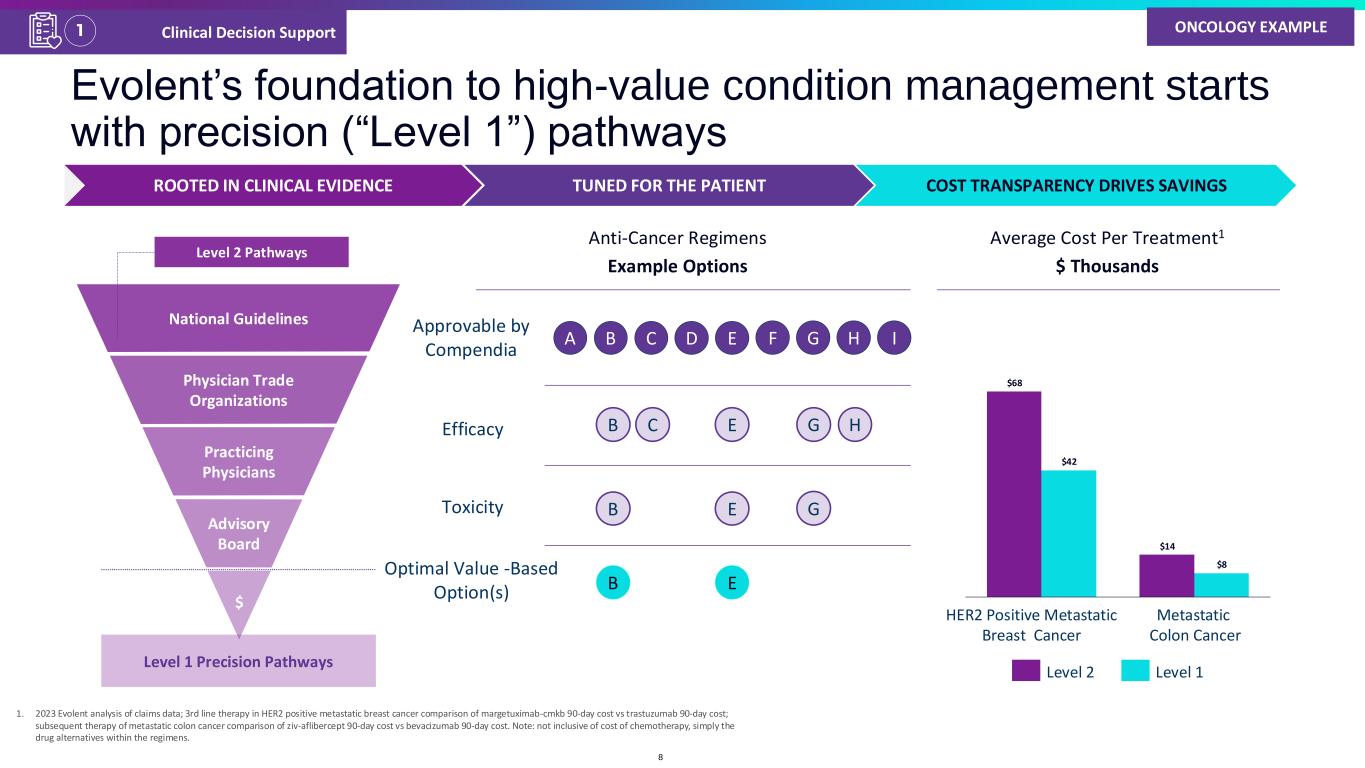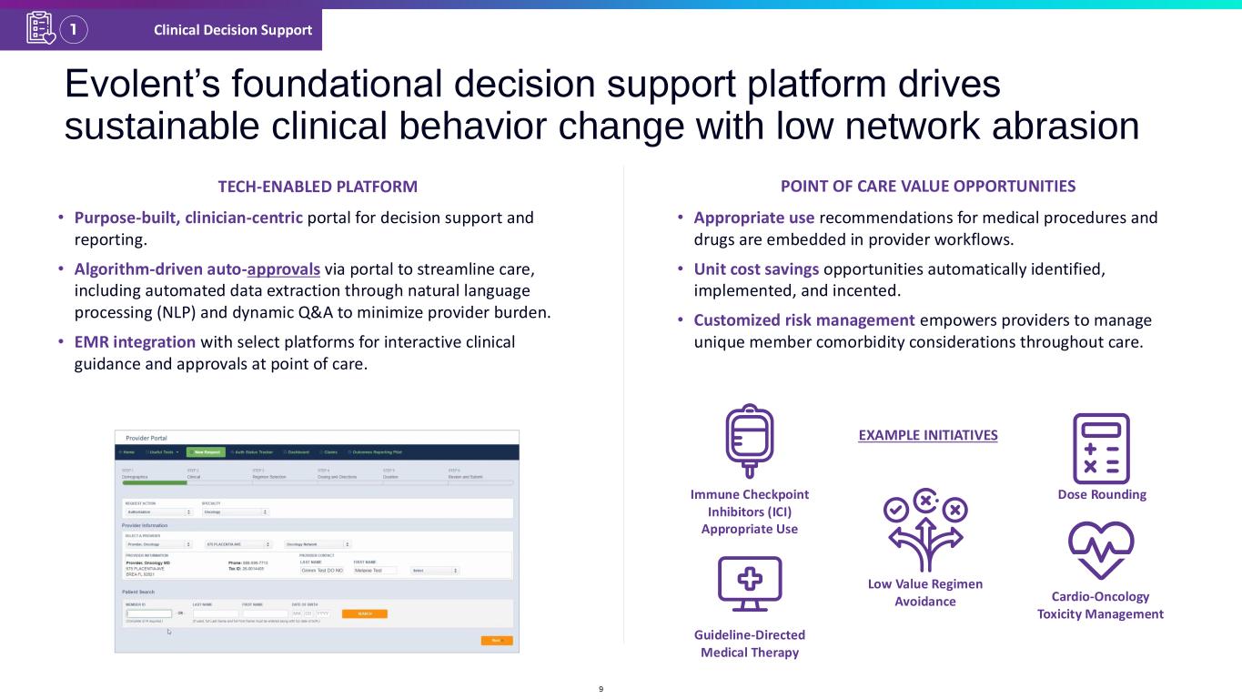 Evolent’s foundation to high-value condition management starts with precision (“Level 1”) pathways Advisory Board $ Practicing Physicians Physician Trade Organizations National Guidelines Level 2 Pathways Level 1 Precision Pathways ROOTED IN CLINICAL EVIDENCE TUNED FOR THE PATIENT COST TRANSPARENCY DRIVES SAVINGS Efficacy Toxicity A B C D E G Optimal Value -Based Option(s) B C E G B E G B $68 $14 $42 $8 E HER2 Positive Metastatic Breast Cancer Metastatic Colon Cancer Level 1Level 2 H H Average Cost Per Treatment1 $ Thousands Anti-Cancer Regimens Example Options IF Approvable by Compendia 1. 2023 Evolent analysis of claims data; 3rd line therapy in HER2 positive metastatic breast cancer comparison of margetuximab-cmkb 90-day cost vs trastuzumab 90-day cost; subsequent therapy of metastatic colon cancer comparison of ziv-aflibercept 90-day cost vs bevacizumab 90-day cost. Note: not inclusive of cost of chemotherapy, simply the drug alternatives within the regimens. ONCOLOGY EXAMPLEClinical Decision Support1 8