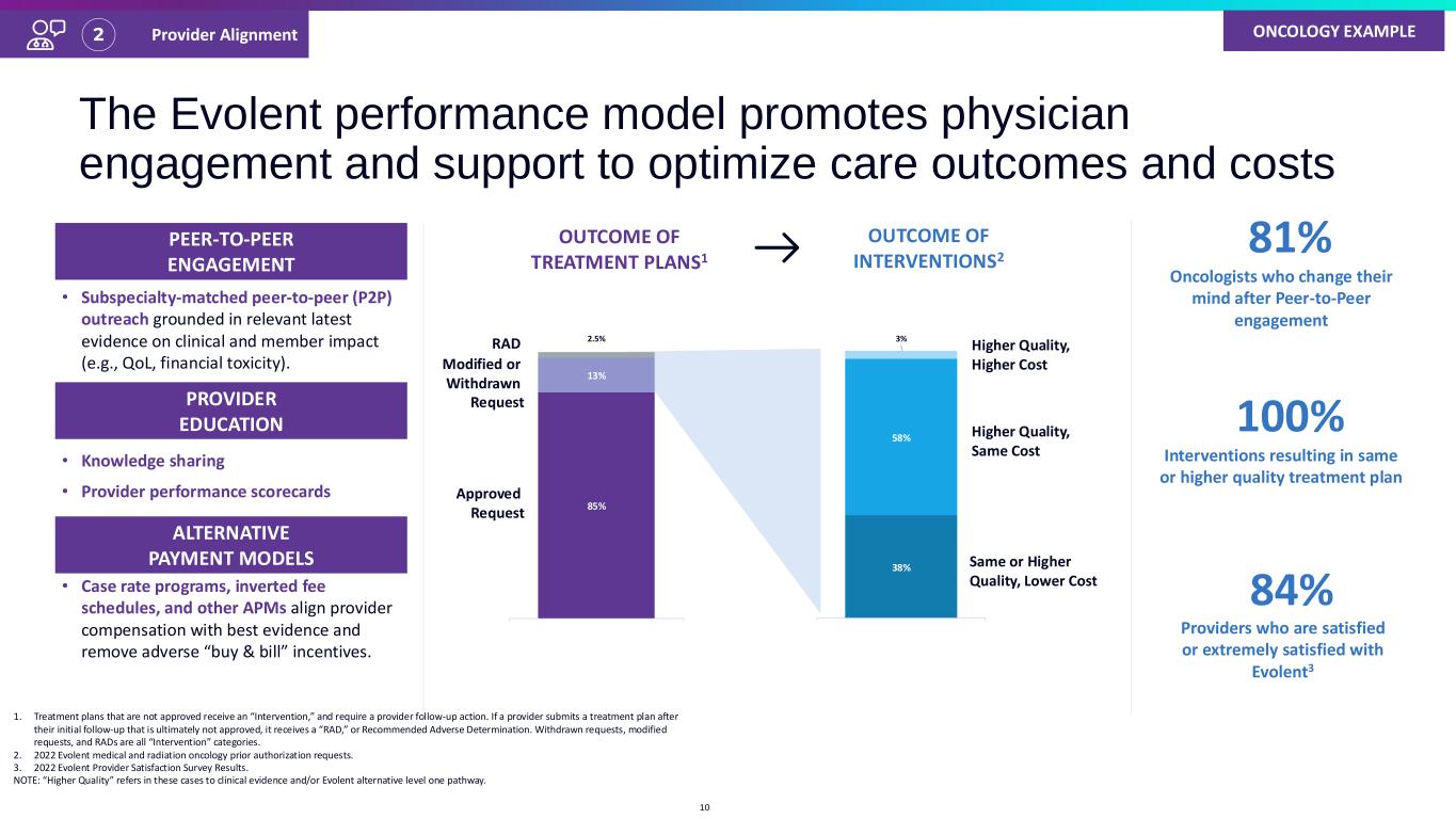 Evolent’s foundational decision support platform drives sustainable clinical behavior change with low network abrasion Optimizing the Requirements• Purpose-built, clinician-centric portal for decision support and reporting. • Algorithm-driven auto-approvals via portal to streamline care, including automated data extraction through natural language processing (NLP) and dynamic Q&A to minimize provider burden. • EMR integration with select platforms for interactive clinical guidance and approvals at point of care. • Appropriate use recommendations for medical procedures and drugs are embedded in provider workflows. • Unit cost savings opportunities automatically identified, implemented, and incented. • Customized risk management empowers providers to manage unique member comorbidity considerations throughout care. Clinical Decision Support TECH-ENABLED PLATFORM POINT OF CARE VALUE OPPORTUNITIES Immune Checkpoint Inhibitors (ICI) Appropriate Use Dose Rounding Guideline-Directed Medical Therapy Cardio-Oncology Toxicity Management Low Value Regimen Avoidance EXAMPLE INITIATIVES 1 9