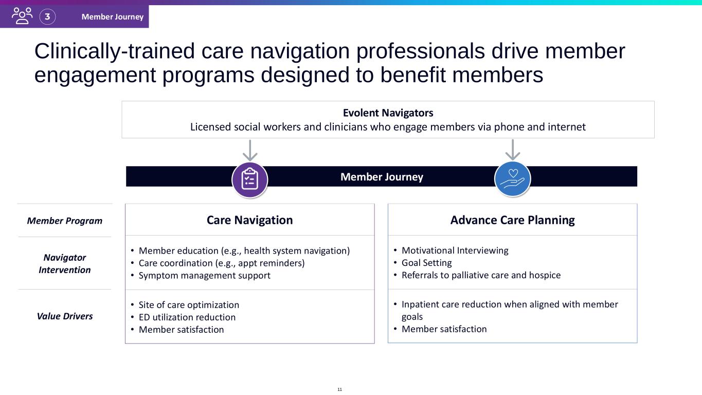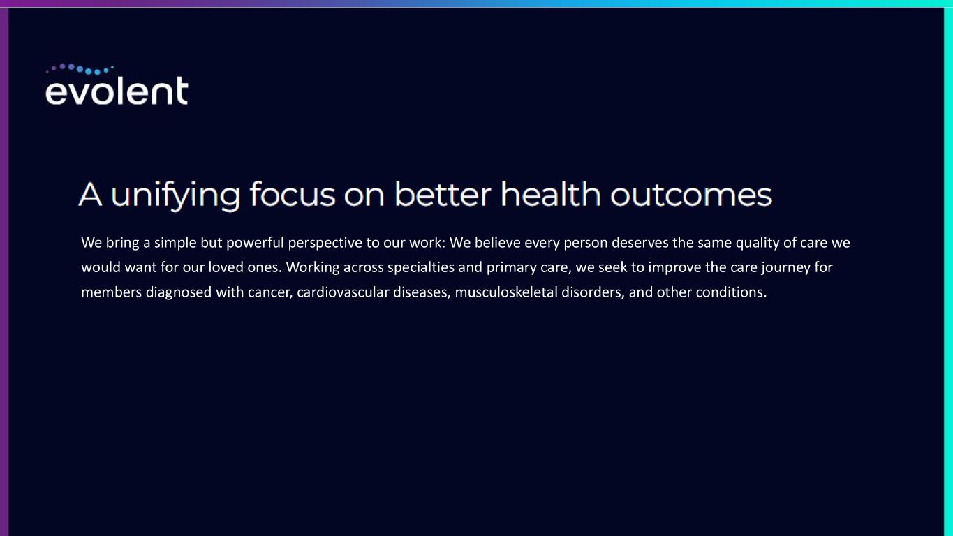The Evolent performance model promotes physician engagement and support to optimize care outcomes and costs 2.5% 1. Treatment plans that are not approved receive an “Intervention,” and require a provider follow-up action. If a provider submits a treatment plan after their initial follow-up that is ultimately not approved, it receives a “RAD,” or Recommended Adverse Determination. Withdrawn requests, modified requests, and RADs are all “Intervention” categories. 2. 2022 Evolent medical and radiation oncology prior authorization requests. 3. 2022 Evolent Provider Satisfaction Survey Results. NOTE: “Higher Quality” refers in these cases to clinical evidence and/or Evolent alternative level one pathway. 85% 38% 58% 3% 85% 13% 2.5% Providers who are satisfied or extremely satisfied with Evolent3 84% Oncologists who change their mind after Peer-to-Peer engagement 81% RAD Approved Request Modified or Withdrawn Request Higher Quality, Higher Cost Higher Quality, Same Cost Same or Higher Quality, Lower Cost OUTCOME OF TREATMENT PLANS1 OUTCOME OF INTERVENTIONS2 • Subspecialty-matched peer-to-peer (P2P) outreach grounded in relevant latest evidence on clinical and member impact (e.g., QoL, financial toxicity). • Knowledge sharing • Provider performance scorecards PEER-TO-PEER ENGAGEMENT PROVIDER EDUCATION ONCOLOGY EXAMPLEProvider Alignment2 • Case rate programs, inverted fee schedules, and other APMs align provider compensation with best evidence and remove adverse “buy & bill” incentives. ALTERNATIVE PAYMENT MODELS Interventions resulting in same or higher quality treatment plan 100% 10