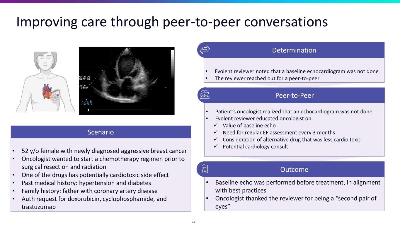 • Baseline echo was performed before treatment, in alignment with best practices • Oncologist thanked the reviewer for being a “second pair of eyes” • Patient’s oncologist realized that an echocardiogram was not done • Evolent reviewer educated oncologist on: ✓ Value of baseline echo ✓ Need for regular EF assessment every 3 months ✓ Consideration of alternative drug that was less cardio toxic ✓ Potential cardiology consult Improving care through peer-to-peer conversations • 52 y/o female with newly diagnosed aggressive breast cancer • Oncologist wanted to start a chemotherapy regimen prior to surgical resection and radiation • One of the drugs has potentially cardiotoxic side effect • Past medical history: hypertension and diabetes • Family history: father with coronary artery disease • Auth request for doxorubicin, cyclophosphamide, and trastuzumab Scenario • Evolent reviewer noted that a baseline echocardiogram was not done • The reviewer reached out for a peer-to-peer Determination Peer-to-Peer Outcome 12