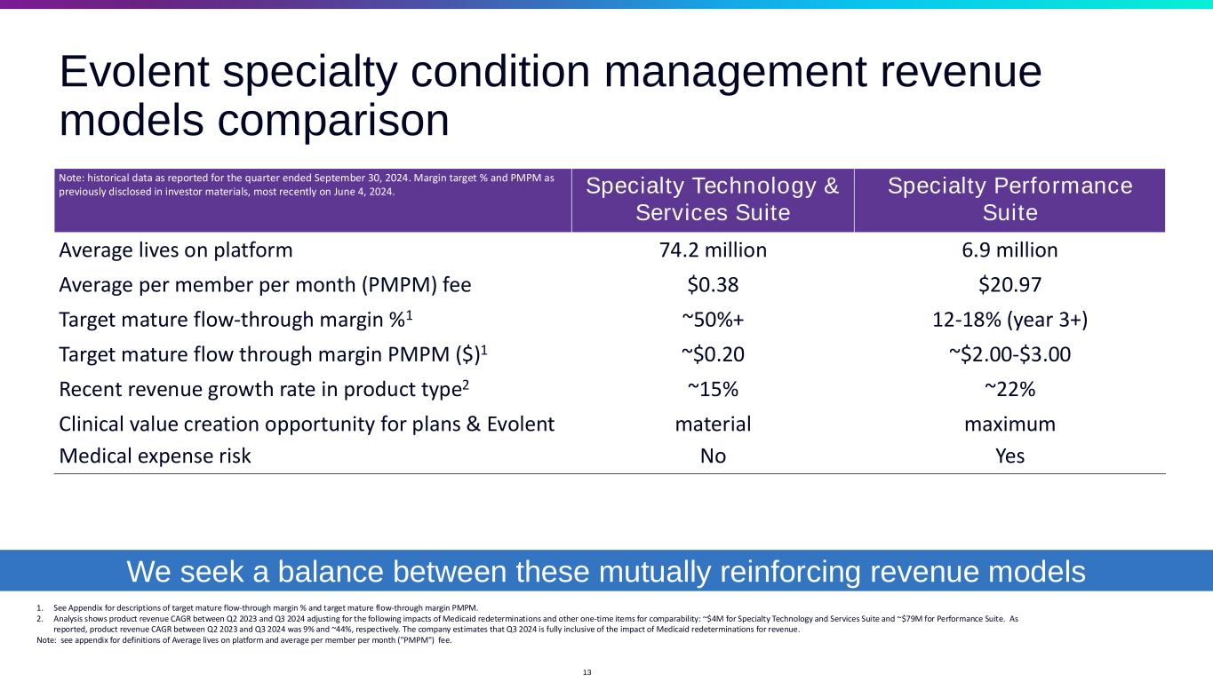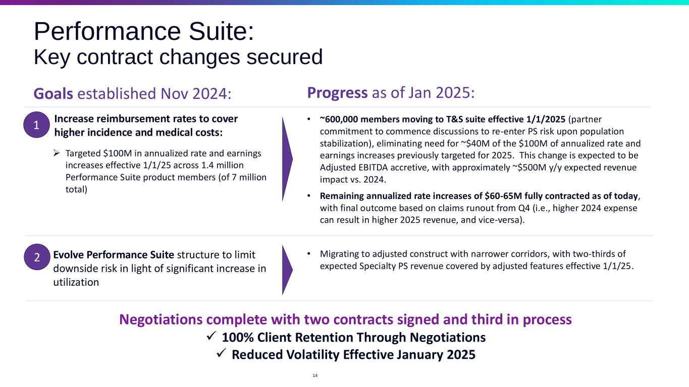 Evolent specialty condition management revenue models comparison Note: historical data as reported for the quarter ended September 30, 2024. Margin target % and PMPM as previously disclosed in investor materials, most recently on June 4, 2024. Specialty Technology & Services Suite Specialty Performance Suite Average lives on platform 74.2 million 6.9 million Average per member per month (PMPM) fee $0.38 $20.97 Target mature flow-through margin %1 ~50%+ 12-18% (year 3+) Target mature flow through margin PMPM ($)1 ~$0.20 ~$2.00-$3.00 Recent revenue growth rate in product type2 ~15% ~22% Clinical value creation opportunity for plans & Evolent material maximum Medical expense risk No Yes 1. See Appendix for descriptions of target mature flow-through margin % and target mature flow-through margin PMPM. 2. Analysis shows product revenue CAGR between Q2 2023 and Q3 2024 adjusting for the following impacts of Medicaid redeterminations and other one-time items for comparability: ~$4M for Specialty Technology and Services Suite and ~$79M for Performance Suite. As reported, product revenue CAGR between Q2 2023 and Q3 2024 was 9% and ~44%, respectively. The company estimates that Q3 2024 is fully inclusive of the impact of Medicaid redeterminations for revenue. Note: see appendix for definitions of Average lives on platform and average per member per month ("PMPM") fee. 13 We seek a balance between these mutually reinforcing revenue models