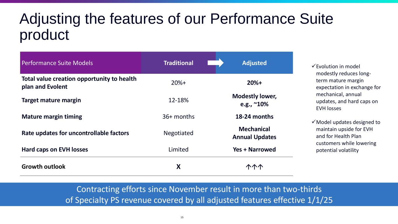Performance Suite: Key contract changes secured Negotiations complete with two contracts signed and third in process ✓ 100% Client Retention Through Negotiations ✓ Reduced Volatility Effective January 2025 1. Increase reimbursement rates to cover higher incidence and medical costs: ➢ Targeted $100M in annualized rate and earnings increases effective 1/1/25 across 1.4 million Performance Suite product members (of 7 million total) Goals established Nov 2024: 2. Evolve Performance Suite structure to limit downside risk in light of significant increase in utilization • ~600,000 members moving to T&S suite effective 1/1/2025 (partner commitment to commence discussions to re-enter PS risk upon population stabilization), eliminating need for ~$40M of the $100M of annualized rate and earnings increases previously targeted for 2025. This change is expected to be Adjusted EBITDA accretive, with approximately ~$500M y/y expected revenue impact vs. 2024. • Remaining annualized rate increases of $60-65M fully contracted as of today, with final outcome based on claims runout from Q4 (i.e., higher 2024 expense can result in higher 2025 revenue, and vice-versa). • Migrating to adjusted construct with narrower corridors, with two-thirds of expected Specialty PS revenue covered by adjusted features effective 1/1/25. 14 Progress as of Jan 2025: 1 2