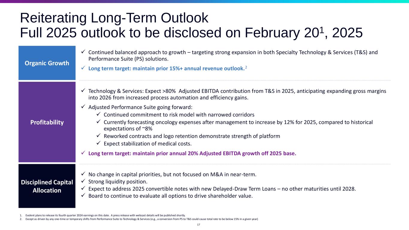 Sizing near-term expected headwinds and tailwinds1 to 2025 Adjusted EBITDA ~$100-105MM ($25MM) ($20MM) Expected EVH Specific Tailwinds Anticipated Sector-Wide Headwinds Strong performance and execution regarding company – specific factors (i.e., rate increases and contracts). Will deliver 2025 outlook along with Q4 2024 results on February 20, 2025. 16 Achieved targeted $100M in expected earnings improvement from PS negotiations, fully contracted. Estimate of potential impact from outsized increase in annual oncology costs (e.g., 12% y/y vs. 8% typical. Estimate of potential impact membership headwind from customer plan shutdowns. 1. The Company’s estimates of potential headwinds and tailwinds are based upon estimates developed by the Company based on information available to the Company as of the date hereof. Facts and circumstances may change. Other factors will impact the company’s financial results, as well as the company’s outlook with respect to 2025 performance, which the Company expects to deliver on February 20, 2025. See disclaimer regarding forward-looking statements on slide 2 or additional information.