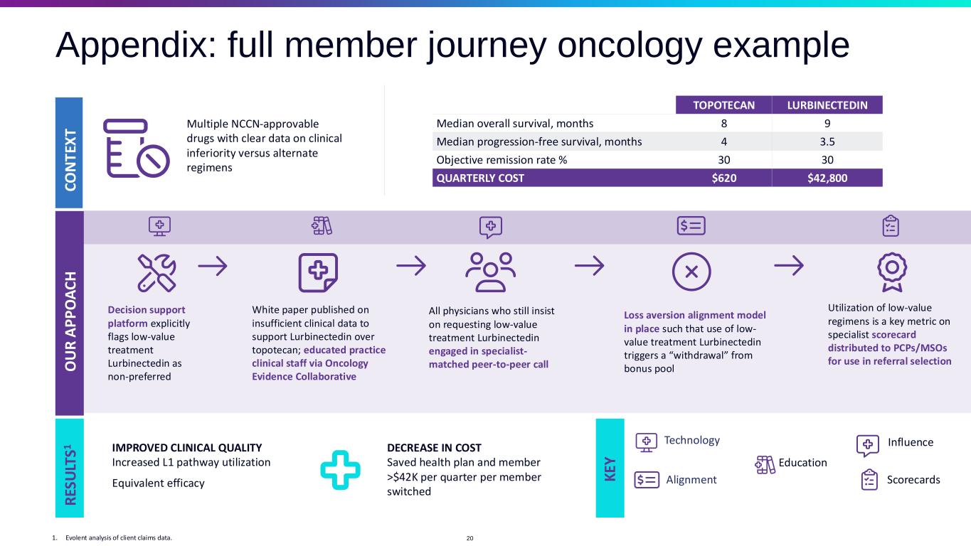 C O N T EX T Multiple NCCN-approvable drugs with clear data on clinical inferiority versus alternate regimens IMPROVED CLINICAL QUALITY Increased L1 pathway utilization Equivalent efficacy R ES U LT S1 TOPOTECAN LURBINECTEDIN Median overall survival, months 8 9 Median progression-free survival, months 4 3.5 Objective remission rate % 30 30 QUARTERLY COST $620 $42,800 Decision support platform explicitly flags low-value treatment Lurbinectedin as non-preferred All physicians who still insist on requesting low-value treatment Lurbinectedin engaged in specialist- matched peer-to-peer call White paper published on insufficient clinical data to support Lurbinectedin over topotecan; educated practice clinical staff via Oncology Evidence Collaborative Loss aversion alignment model in place such that use of low- value treatment Lurbinectedin triggers a “withdrawal” from bonus pool Utilization of low-value regimens is a key metric on specialist scorecard distributed to PCPs/MSOs for use in referral selection DECREASE IN COST Saved health plan and member >$42K per quarter per member switched 1. Evolent analysis of client claims data. InfluenceTechnology Education Alignment Scorecards O U R A P P O A C H K EY Appendix: full member journey oncology example 20