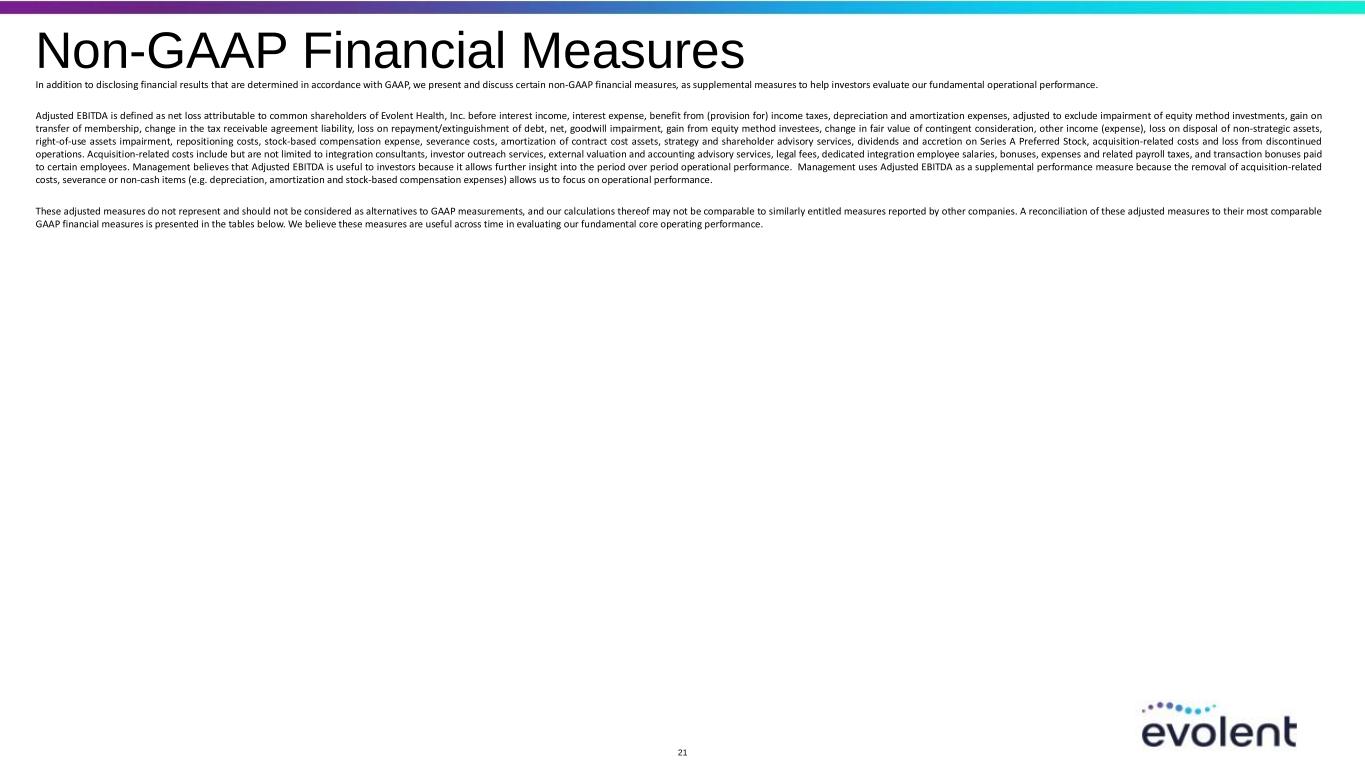 Non-GAAP Financial Measures In addition to disclosing financial results that are determined in accordance with GAAP, we present and discuss certain non-GAAP financial measures, as supplemental measures to help investors evaluate our fundamental operational performance. Adjusted EBITDA is defined as net loss attributable to common shareholders of Evolent Health, Inc. before interest income, interest expense, benefit from (provision for) income taxes, depreciation and amortization expenses, adjusted to exclude impairment of equity method investments, gain on transfer of membership, change in the tax receivable agreement liability, loss on repayment/extinguishment of debt, net, goodwill impairment, gain from equity method investees, change in fair value of contingent consideration, other income (expense), loss on disposal of non-strategic assets, right-of-use assets impairment, repositioning costs, stock-based compensation expense, severance costs, amortization of contract cost assets, strategy and shareholder advisory services, dividends and accretion on Series A Preferred Stock, acquisition-related costs and loss from discontinued operations. Acquisition-related costs include but are not limited to integration consultants, investor outreach services, external valuation and accounting advisory services, legal fees, dedicated integration employee salaries, bonuses, expenses and related payroll taxes, and transaction bonuses paid to certain employees. Management believes that Adjusted EBITDA is useful to investors because it allows further insight into the period over period operational performance. Management uses Adjusted EBITDA as a supplemental performance measure because the removal of acquisition-related costs, severance or non-cash items (e.g. depreciation, amortization and stock-based compensation expenses) allows us to focus on operational performance. These adjusted measures do not represent and should not be considered as alternatives to GAAP measurements, and our calculations thereof may not be comparable to similarly entitled measures reported by other companies. A reconciliation of these adjusted measures to their most comparable GAAP financial measures is presented in the tables below. We believe these measures are useful across time in evaluating our fundamental core operating performance. 21