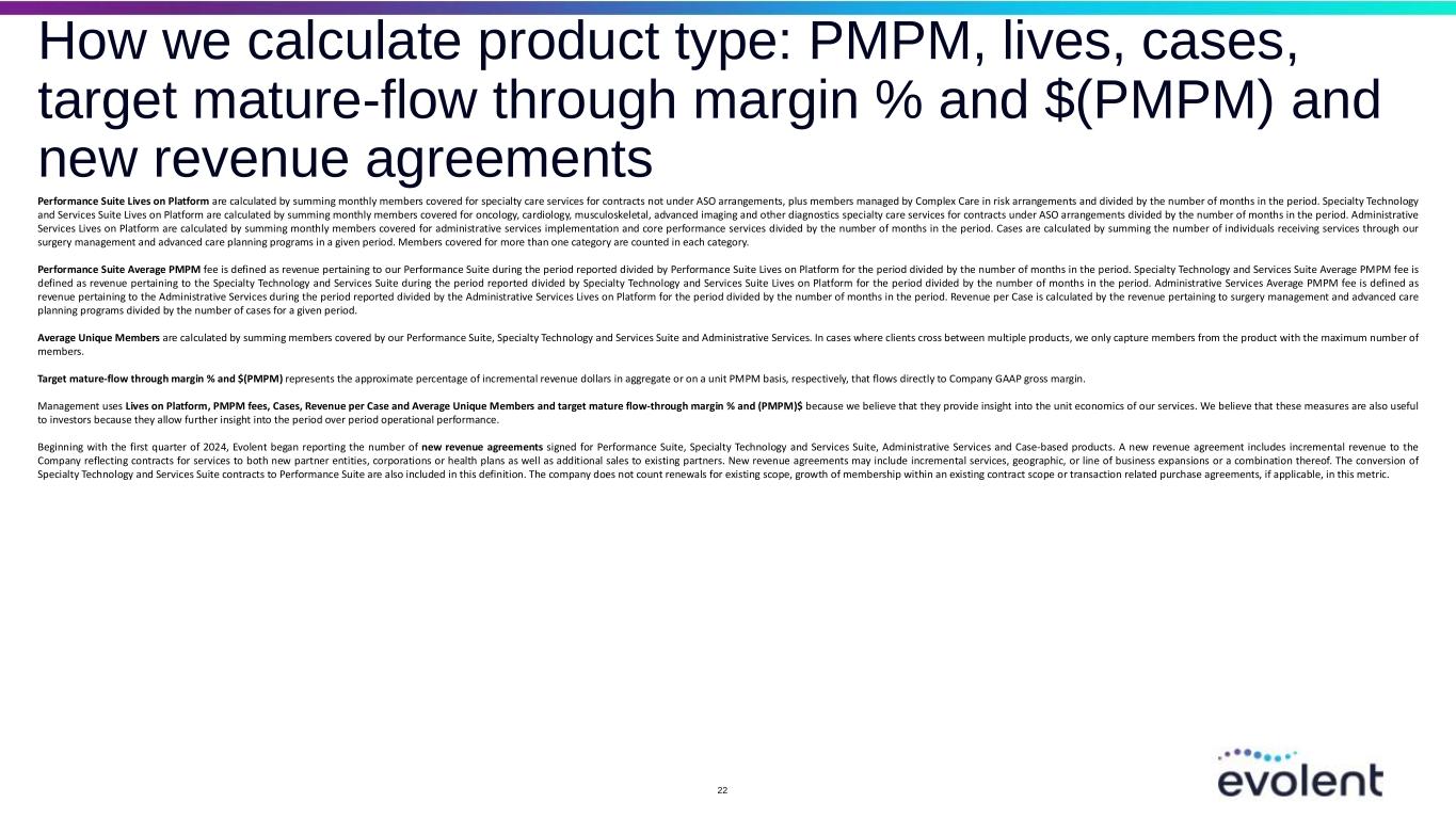 How we calculate product type: PMPM, lives, cases, target mature-flow through margin % and $(PMPM) and new revenue agreements Performance Suite Lives on Platform are calculated by summing monthly members covered for specialty care services for contracts not under ASO arrangements, plus members managed by Complex Care in risk arrangements and divided by the number of months in the period. Specialty Technology and Services Suite Lives on Platform are calculated by summing monthly members covered for oncology, cardiology, musculoskeletal, advanced imaging and other diagnostics specialty care services for contracts under ASO arrangements divided by the number of months in the period. Administrative Services Lives on Platform are calculated by summing monthly members covered for administrative services implementation and core performance services divided by the number of months in the period. Cases are calculated by summing the number of individuals receiving services through our surgery management and advanced care planning programs in a given period. Members covered for more than one category are counted in each category. Performance Suite Average PMPM fee is defined as revenue pertaining to our Performance Suite during the period reported divided by Performance Suite Lives on Platform for the period divided by the number of months in the period. Specialty Technology and Services Suite Average PMPM fee is defined as revenue pertaining to the Specialty Technology and Services Suite during the period reported divided by Specialty Technology and Services Suite Lives on Platform for the period divided by the number of months in the period. Administrative Services Average PMPM fee is defined as revenue pertaining to the Administrative Services during the period reported divided by the Administrative Services Lives on Platform for the period divided by the number of months in the period. Revenue per Case is calculated by the revenue pertaining to surgery management and advanced care planning programs divided by the number of cases for a given period. Average Unique Members are calculated by summing members covered by our Performance Suite, Specialty Technology and Services Suite and Administrative Services. In cases where clients cross between multiple products, we only capture members from the product with the maximum number of members. Target mature-flow through margin % and $(PMPM) represents the approximate percentage of incremental revenue dollars in aggregate or on a unit PMPM basis, respectively, that flows directly to Company GAAP gross margin. Management uses Lives on Platform, PMPM fees, Cases, Revenue per Case and Average Unique Members and target mature flow-through margin % and (PMPM)$ because we believe that they provide insight into the unit economics of our services. We believe that these measures are also useful to investors because they allow further insight into the period over period operational performance. Beginning with the first quarter of 2024, Evolent began reporting the number of new revenue agreements signed for Performance Suite, Specialty Technology and Services Suite, Administrative Services and Case-based products. A new revenue agreement includes incremental revenue to the Company reflecting contracts for services to both new partner entities, corporations or health plans as well as additional sales to existing partners. New revenue agreements may include incremental services, geographic, or line of business expansions or a combination thereof. The conversion of Specialty Technology and Services Suite contracts to Performance Suite are also included in this definition. The company does not count renewals for existing scope, growth of membership within an existing contract scope or transaction related purchase agreements, if applicable, in this metric. 22