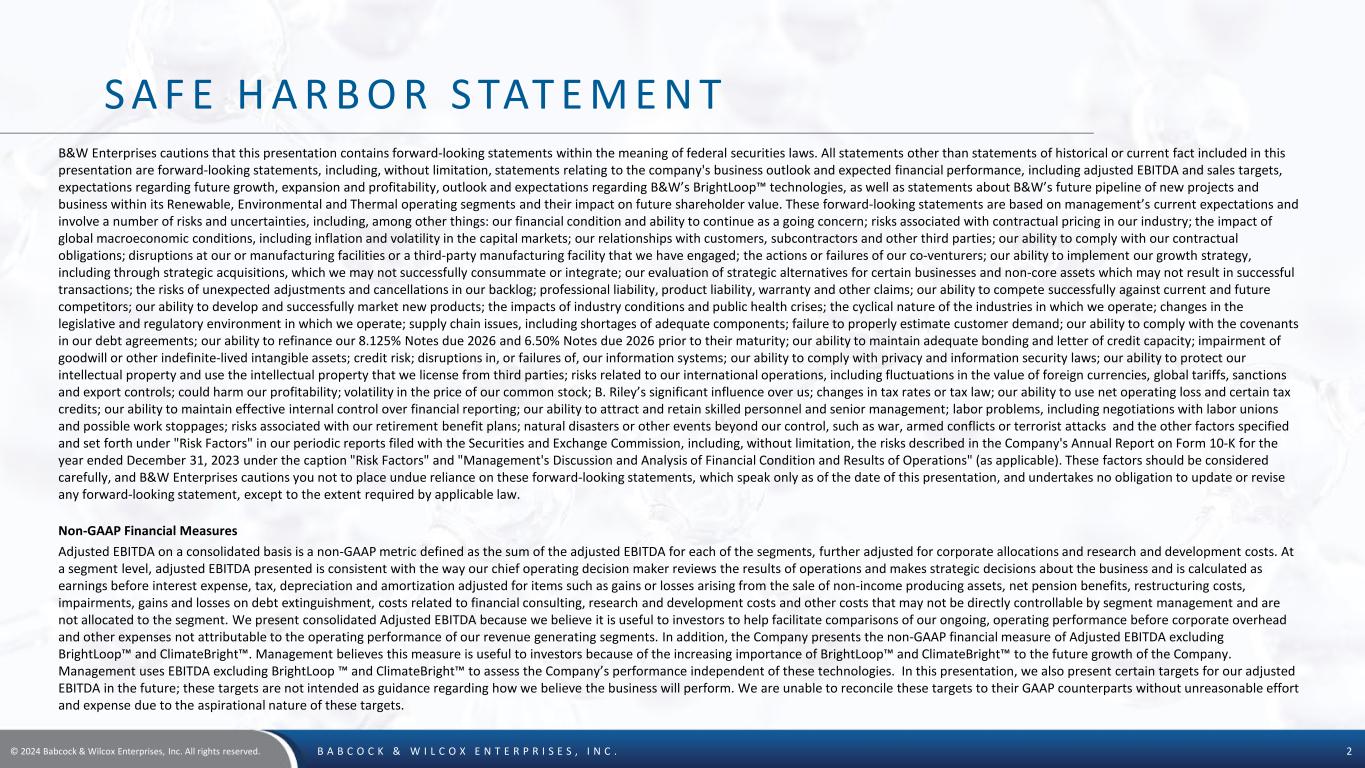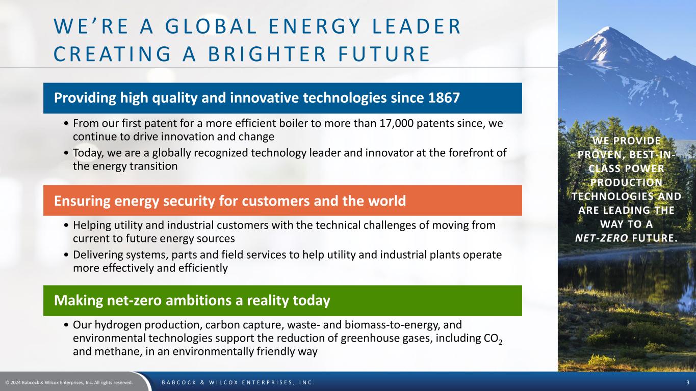 © 2024 Babcock & Wilcox Enterprises, Inc. All rights reserved. B A B C O C K & W I L C O X E N T E R P R I S E S , I N C . 2 S A F E H A R B O R S TAT E M E N T B&W Enterprises cautions that this presentation contains forward-looking statements within the meaning of federal securities laws. All statements other than statements of historical or current fact included in this presentation are forward-looking statements, including, without limitation, statements relating to the company's business outlook and expected financial performance, including adjusted EBITDA and sales targets, expectations regarding future growth, expansion and profitability, outlook and expectations regarding B&W’s BrightLoop™ technologies, as well as statements about B&W’s future pipeline of new projects and business within its Renewable, Environmental and Thermal operating segments and their impact on future shareholder value. These forward-looking statements are based on management’s current expectations and involve a number of risks and uncertainties, including, among other things: our financial condition and ability to continue as a going concern; risks associated with contractual pricing in our industry; the impact of global macroeconomic conditions, including inflation and volatility in the capital markets; our relationships with customers, subcontractors and other third parties; our ability to comply with our contractual obligations; disruptions at our or manufacturing facilities or a third-party manufacturing facility that we have engaged; the actions or failures of our co-venturers; our ability to implement our growth strategy, including through strategic acquisitions, which we may not successfully consummate or integrate; our evaluation of strategic alternatives for certain businesses and non-core assets which may not result in successful transactions; the risks of unexpected adjustments and cancellations in our backlog; professional liability, product liability, warranty and other claims; our ability to compete successfully against current and future competitors; our ability to develop and successfully market new products; the impacts of industry conditions and public health crises; the cyclical nature of the industries in which we operate; changes in the legislative and regulatory environment in which we operate; supply chain issues, including shortages of adequate components; failure to properly estimate customer demand; our ability to comply with the covenants in our debt agreements; our ability to refinance our 8.125% Notes due 2026 and 6.50% Notes due 2026 prior to their maturity; our ability to maintain adequate bonding and letter of credit capacity; impairment of goodwill or other indefinite-lived intangible assets; credit risk; disruptions in, or failures of, our information systems; our ability to comply with privacy and information security laws; our ability to protect our intellectual property and use the intellectual property that we license from third parties; risks related to our international operations, including fluctuations in the value of foreign currencies, global tariffs, sanctions and export controls; could harm our profitability; volatility in the price of our common stock; B. Riley’s significant influence over us; changes in tax rates or tax law; our ability to use net operating loss and certain tax credits; our ability to maintain effective internal control over financial reporting; our ability to attract and retain skilled personnel and senior management; labor problems, including negotiations with labor unions and possible work stoppages; risks associated with our retirement benefit plans; natural disasters or other events beyond our control, such as war, armed conflicts or terrorist attacks and the other factors specified and set forth under "Risk Factors" in our periodic reports filed with the Securities and Exchange Commission, including, without limitation, the risks described in the Company's Annual Report on Form 10-K for the year ended December 31, 2023 under the caption "Risk Factors" and "Management's Discussion and Analysis of Financial Condition and Results of Operations" (as applicable). These factors should be considered carefully, and B&W Enterprises cautions you not to place undue reliance on these forward-looking statements, which speak only as of the date of this presentation, and undertakes no obligation to update or revise any forward-looking statement, except to the extent required by applicable law. Non-GAAP Financial Measures Adjusted EBITDA on a consolidated basis is a non-GAAP metric defined as the sum of the adjusted EBITDA for each of the segments, further adjusted for corporate allocations and research and development costs. At a segment level, adjusted EBITDA presented is consistent with the way our chief operating decision maker reviews the results of operations and makes strategic decisions about the business and is calculated as earnings before interest expense, tax, depreciation and amortization adjusted for items such as gains or losses arising from the sale of non-income producing assets, net pension benefits, restructuring costs, impairments, gains and losses on debt extinguishment, costs related to financial consulting, research and development costs and other costs that may not be directly controllable by segment management and are not allocated to the segment. We present consolidated Adjusted EBITDA because we believe it is useful to investors to help facilitate comparisons of our ongoing, operating performance before corporate overhead and other expenses not attributable to the operating performance of our revenue generating segments. In addition, the Company presents the non-GAAP financial measure of Adjusted EBITDA excluding BrightLoop™ and ClimateBright™. Management believes this measure is useful to investors because of the increasing importance of BrightLoop™ and ClimateBright™ to the future growth of the Company. Ma