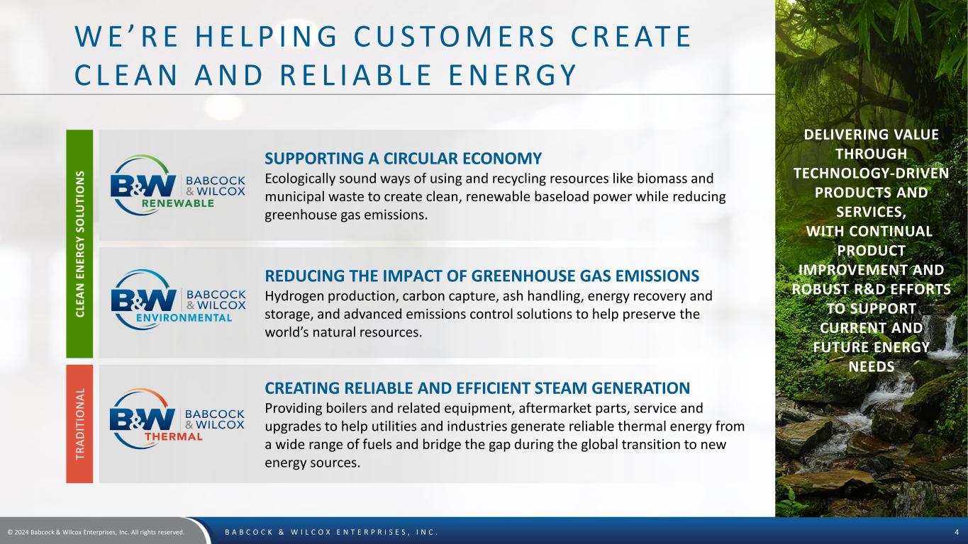 © 2024 Babcock & Wilcox Enterprises, Inc. All rights reserved. B A B C O C K & W I L C O X E N T E R P R I S E S , I N C . 3 W E ’ R E A G L O B A L E N E R G Y L E A D E R C R E AT I N G A B R I G H T E R F U T U R E WE PROVIDE PROVEN, BEST-IN- CLASS POWER PRODUCTION TECHNOLOGIES AND ARE LEADING THE WAY TO A NET-ZERO FUTURE. • From our first patent for a more efficient boiler to more than 17,000 patents since, we continue to drive innovation and change • Today, we are a globally recognized technology leader and innovator at the forefront of the energy transition • Helping utility and industrial customers with the technical challenges of moving from current to future energy sources • Delivering systems, parts and field services to help utility and industrial plants operate more effectively and efficiently • Our hydrogen production, carbon capture, waste- and biomass-to-energy, and environmental technologies support the reduction of greenhouse gases, including CO2 and methane, in an environmentally friendly way Ensuring energy security for customers and the world Making net-zero ambitions a reality today Providing high quality and innovative technologies since 1867
