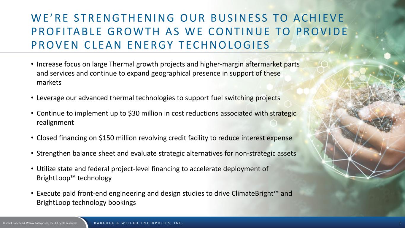 © 2024 Babcock & Wilcox Enterprises, Inc. All rights reserved. B A B C O C K & W I L C O X E N T E R P R I S E S , I N C . 5 T H E F O U N D AT I O N O F O U R C O M PA N Y Our Vision: Advancing energy and environmental solutions that bring power and progress to our world. Our Mission: B&W delivers environmentally conscious, technology-driven solutions and services to energy and industrial customers worldwide – safely, ethically and as promised. Our Core Values: Safety • Integrity • Quality • Respect • Agility