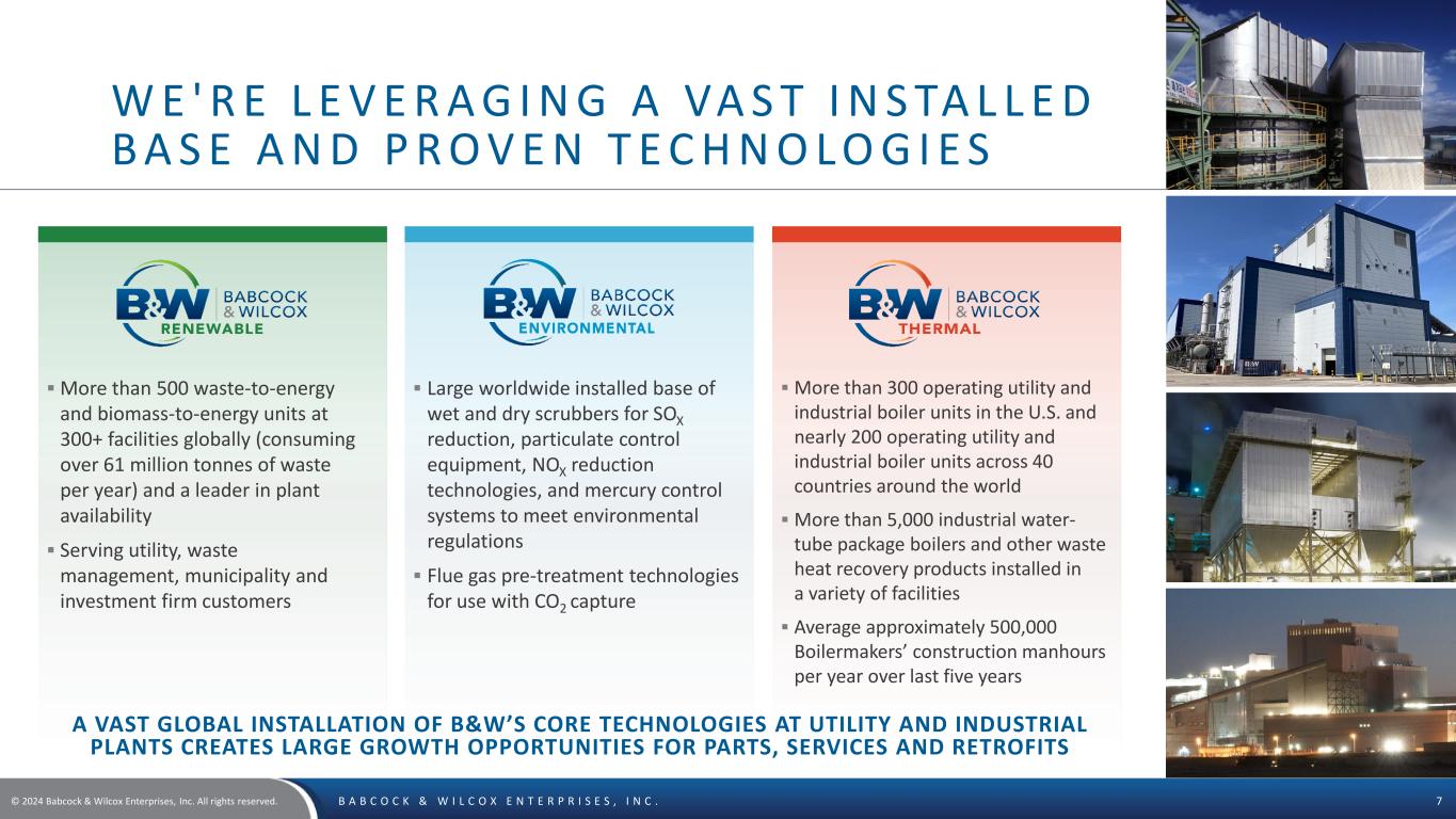 © 2024 Babcock & Wilcox Enterprises, Inc. All rights reserved. B A B C O C K & W I L C O X E N T E R P R I S E S , I N C . 6 • Increase focus on large Thermal growth projects and higher-margin aftermarket parts and services and continue to expand geographical presence in support of these markets • Leverage our advanced thermal technologies to support fuel switching projects • Continue to implement up to $30 million in cost reductions associated with strategic realignment • Closed financing on $150 million revolving credit facility to reduce interest expense • Strengthen balance sheet and evaluate strategic alternatives for non-strategic assets • Utilize state and federal project-level financing to accelerate deployment of BrightLoop™ technology • Execute paid front-end engineering and design studies to drive ClimateBright™ and BrightLoop technology bookings W E ’ R E S T R E N G T H E N I N G O U R B U S I N E S S TO A C H I E V E P R O F I TA B L E G R O W T H A S W E C O N T I N U E TO P R OV I D E P R OV E N C L E A N E N E R GY T EC H N O LO G I E S