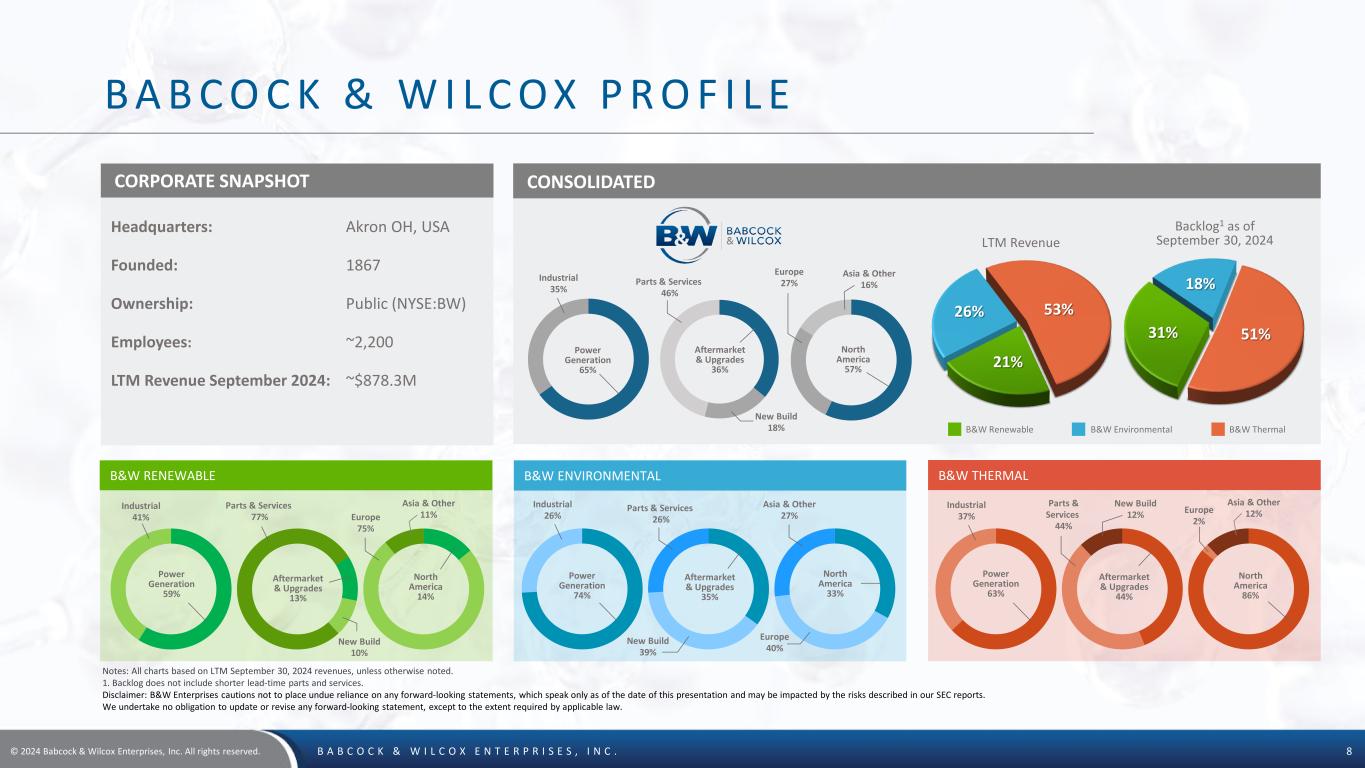 © 2024 Babcock & Wilcox Enterprises, Inc. All rights reserved. B A B C O C K & W I L C O X E N T E R P R I S E S , I N C . 7 W E ' R E L E V E R A G I N G A VA S T I N S TA L L E D B A S E A N D P R O V E N T E C H N O L O G I E S More than 300 operating utility and industrial boiler units in the U.S. and nearly 200 operating utility and industrial boiler units across 40 countries around the world More than 5,000 industrial water- tube package boilers and other waste heat recovery products installed in a variety of facilities  Average approximately 500,000 Boilermakers’ construction manhours per year over last five years More than 500 waste-to-energy and biomass-to-energy units at 300+ facilities globally (consuming over 61 million tonnes of waste per year) and a leader in plant availability  Serving utility, waste management, municipality and investment firm customers  Large worldwide installed base of wet and dry scrubbers for SOX reduction, particulate control equipment, NOX reduction technologies, and mercury control systems to meet environmental regulations  Flue gas pre-treatment technologies for use with CO2 capture A VAST GLOBAL INSTALLATION OF B&W’S CORE TECHNOLOGIES AT UTILITY AND INDUSTRIAL PLANTS CREATES LARGE GROWTH OPPORTUNITIES FOR PARTS, SERVICES AND RETROFITS