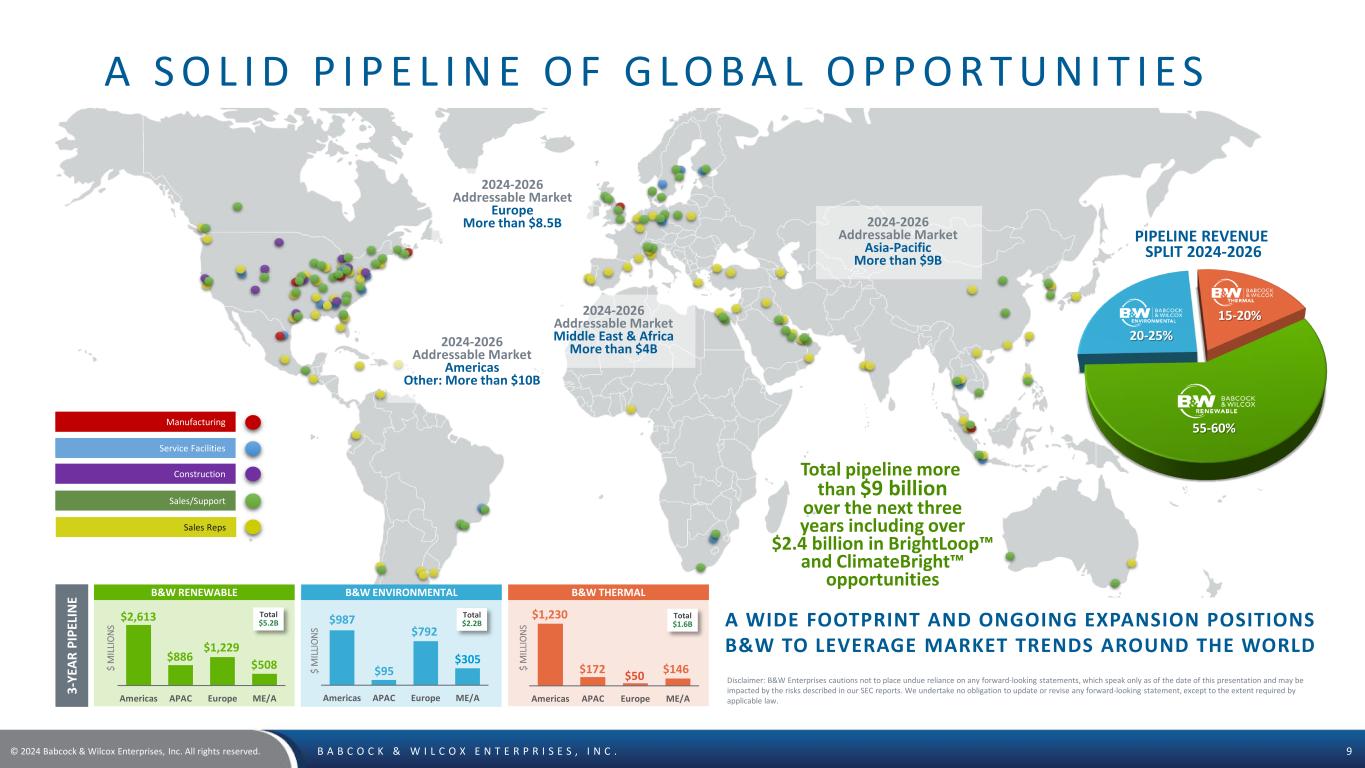 © 2024 Babcock & Wilcox Enterprises, Inc. All rights reserved. B A B C O C K & W I L C O X E N T E R P R I S E S , I N C . 8 CORPORATE SNAPSHOT B A B C O C K & W I L C OX P R O F I L E Notes: All charts based on LTM September 30, 2024 revenues, unless otherwise noted. 1. Backlog does not include shorter lead-time parts and services. Disclaimer: B&W Enterprises cautions not to place undue reliance on any forward-looking statements, which speak only as of the date of this presentation and may be impacted by the risks described in our SEC reports. We undertake no obligation to update or revise any forward-looking statement, except to the extent required by applicable law. Headquarters: Akron OH, USA Founded: 1867 Ownership: Public (NYSE:BW) Employees: ~2,200 LTM Revenue September 2024: ~$878.3M B&W RENEWABLE Power Generation 59% Industrial 41% Aftermarket & Upgrades 13% Parts & Services 77% North America 14% Europe 75% Asia & Other 11% New Build 10% B&W THERMAL Industrial 37% Power Generation 63% Aftermarket & Upgrades 44% Parts & Services 44% North America 86% Europe 2% Asia & Other 12% New Build 12% B&W ENVIRONMENTAL Industrial 26% Power Generation 74% Aftermarket & Upgrades 35% Parts & Services 26% North America 33% Europe 40% New Build 39% Asia & Other 27% CONSOLIDATED 21% 26% 53% 31% 18% 51% Industrial 35% Power Generation 65% Aftermarket & Upgrades 36% Parts & Services 46% New Build 18% North America 57% Europe 27% Asia & Other 16% Backlog1 as of September 30, 2024 B&W Renewable LTM Revenue B&W Environmental B&W Thermal