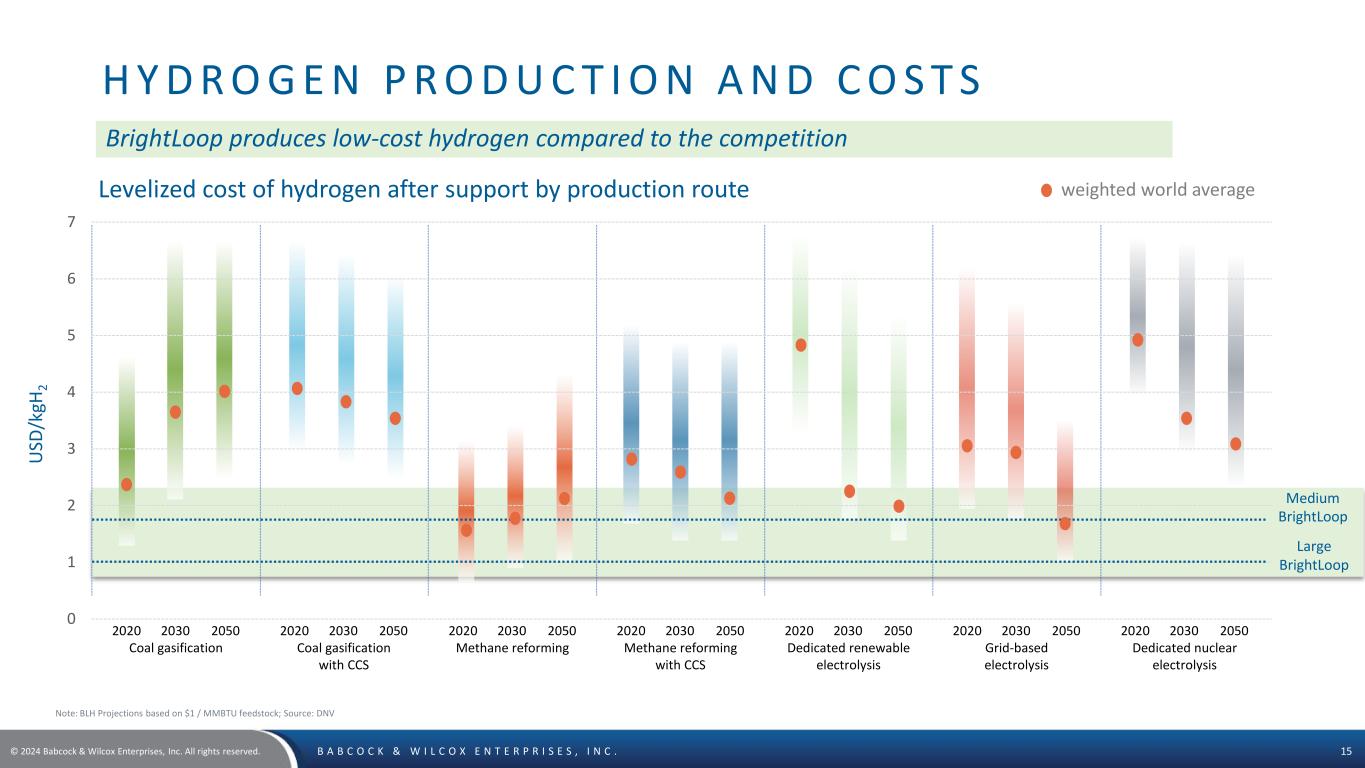 © 2024 Babcock & Wilcox Enterprises, Inc. All rights reserved. B A B C O C K & W I L C O X E N T E R P R I S E S , I N C . 14 U N L O C K I N G F U T U R E R E V E N U E P O T E N T I A L O F B R I G H T L O O P A N D P O S I T I O N B A S E D O N M A R K E T W I T H S I G N I F I C A N T G R O W T H O F H Y D R O G E N P R O J E C T E D Achieving only 1% market share of a $140B U.S. market 3-5 Large Unit Projects 2-4 Medium Unit Projects 3-8 Small Unit Projects annual revenues at 25%+ Gross Margin B&W Project Timeline: • 2026 – Producing hydrogen from the first small unit • 2028 – Producing hydrogen from the first medium unit • 2030 – Booking multiple units of each size per year ~$1 Billion Target Market Share Assumed Mix of Projects 2030 Approximate Revenue *Market Data from IEA Net Zero by 2050 A Roadmap for the Global Energy Sector B & W c u r r e n t l y h a s 8 p r o j e c t s i n p i p e l i n e w h i c h a l o n e t o t a l o v e r $ 1 B i l l i o n