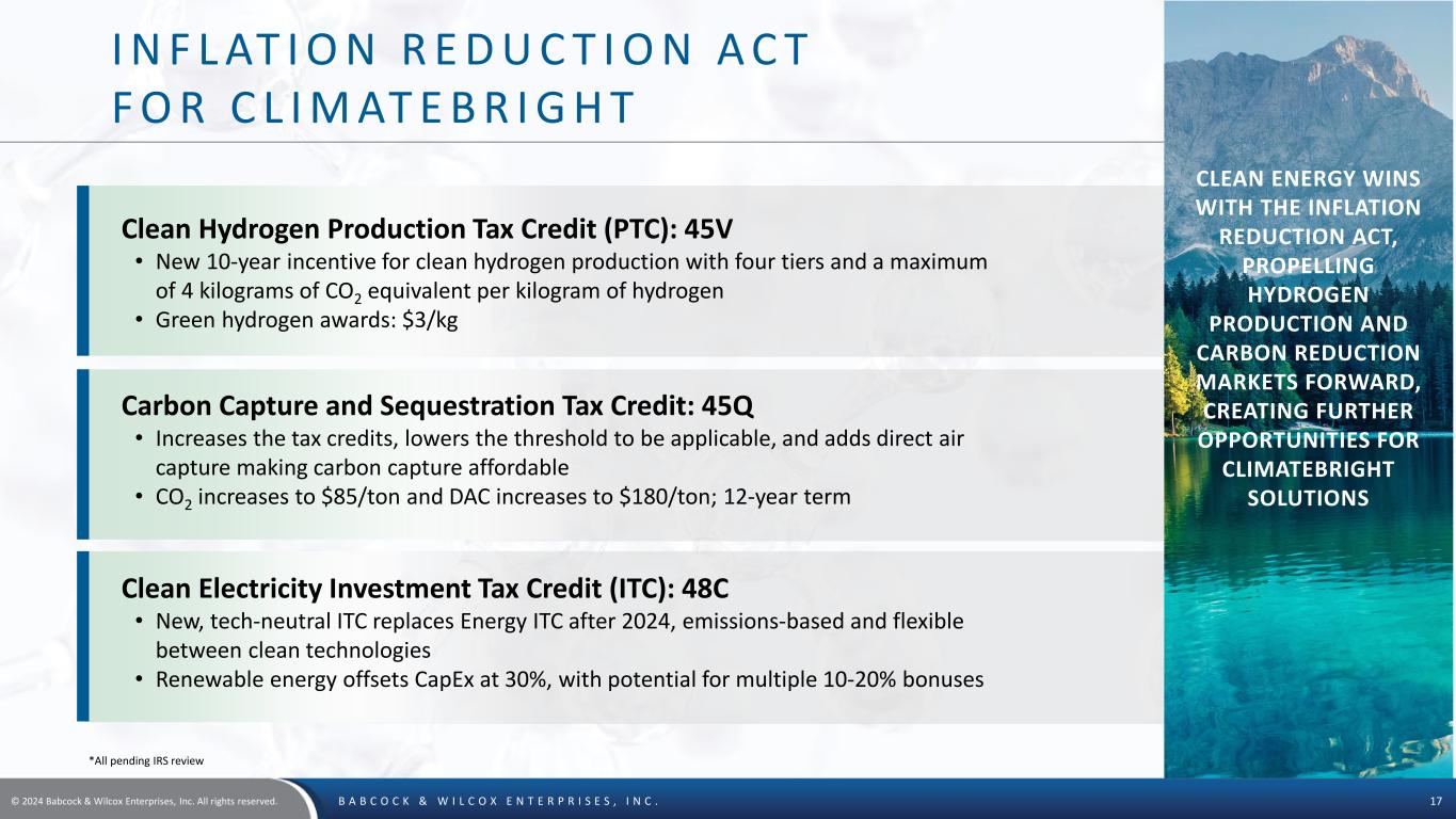 © 2024 Babcock & Wilcox Enterprises, Inc. All rights reserved. B A B C O C K & W I L C O X E N T E R P R I S E S , I N C . 16 G L O B A L L E A D E R I N C L E A N P O W E R P R O D U C T I O N T E C H N O L O G I E S — O U R C L I M AT E B R I G H T S U I T E • B&W is at the forefront of developing CO2 capturing technologies • Multiple technologies ready for commercial demonstration • 93 active patents related to carbon capture technology • Positioned to provide critical solutions to meet global climate goals BrightLoop™ HYDROGEN PRODUCTION OxyBright™ OXYGEN-FUEL COMBUSTION SolveBright™ POST-COMBUSTION CARBON CAPTURE BrightGen™ HYDROGEN COMBUSTION Long Duration Energy Storage Green Steam Direct Air Capture HOT SAND SILO COLD SAND SILO EMERGING TECHNOLOGIES B&W’S PORTFOLIO OF CLEAN POWER PRODUCTION SOLUTIONS CONTINUES TO EVOLVE TO REACH CUSTOMERS AT ALL STAGES OF THEIR ENERGY TRANSITION.