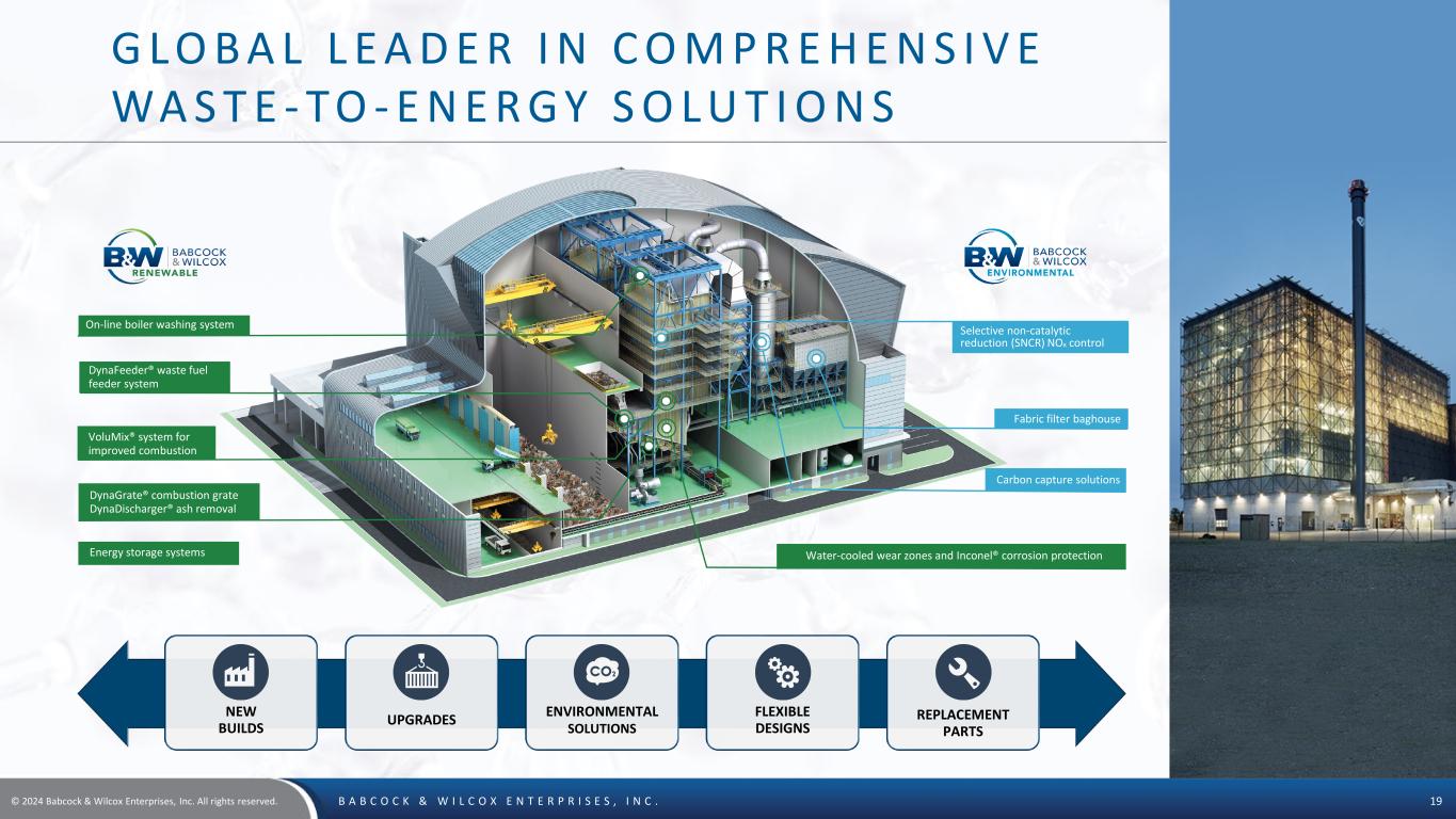 © 2024 Babcock & Wilcox Enterprises, Inc. All rights reserved. B A B C O C K & W I L C O X E N T E R P R I S E S , I N C . 18 B & W ’ S WA S T E - TO - E N E R G Y T E C H N O L O G Y R E D U C E S M E T H A N E E M I S S I O N S • Methane has 84 times the Global Warming Potential (GWP) of CO2 i • Annual additions to landfills in the U.S.ii produce emissions equivalent to 10 million cars • Landfills in the U.S.iii emit more than 330 million tons of 20- year basis GWP each year, roughly equal to 70 million carsiv • Waste-to-Energy (WTE) avoids landfilling while producing baseload clean energy WTE TECHNOLOGIES • Boiler/steam generation island • DynaGrate® combustion grate • Fuel handling systems • Emissions control equipment • B&W’s state-of-the-art technology has been installed in more than 500 units in more than 30 countries, including: • The most recent WTE facility in the U.S. (Palm Beach Renewable Energy Facility, Florida) • One of the world’s largest waste treatment facilities (Shenzhen East, China) i Anthropogenic and Natural Radiative Forcing. In: Climate Change 2013: The Physical Science Basis. Contribution of Working Group I to the Fifth Assessment Report of the Intergovernmental Panel on Climate Change [Stocker, T.F., D. Qin, G.-K. Plattner, M. Tignor, S.K. Allen, J. Boschung, A. Nauels, Y. Xia, V. Bex and P.M. Midgley (eds.)]. Cambridge University Press, Cambridge, United Kingdom and New York, NY, USA. https://www.ipcc.ch/site/assets/uploads/2018/02/WG1AR5_Chapter08_FINAL.pdf; 20-year basis ii EIA Biomass Explained: Waste-to-energy (Municipal Solid Waste), November 29, 2020 https://www.eia.gov/energyexplained/biomass/waste-to-energy.php iii EPA Landfill Methane Outreach Program: Project and Landfill Data by State; https://www.epa.gov/lmop/project-and-landfill-data-state#:~:text=The%20LMOP%20Landfill%20and%20Landfill,more%20than%202%2C600%20MSW%20landfills and EPA U.S. Greenhouse Gas Inventory 2020, Chapter 7: Waste, Section 7.1 Landfills (CRF Source Category 5A1) iv Equivalent car emissions calculated using EPA metric of 4.6 metric tons of CO2 per year per passenger car B&W IS ACTIVELY DEPLOYING TECHNOLOGY THAT CURBS THE GLOBAL WARMING IMPACT OF METHANE