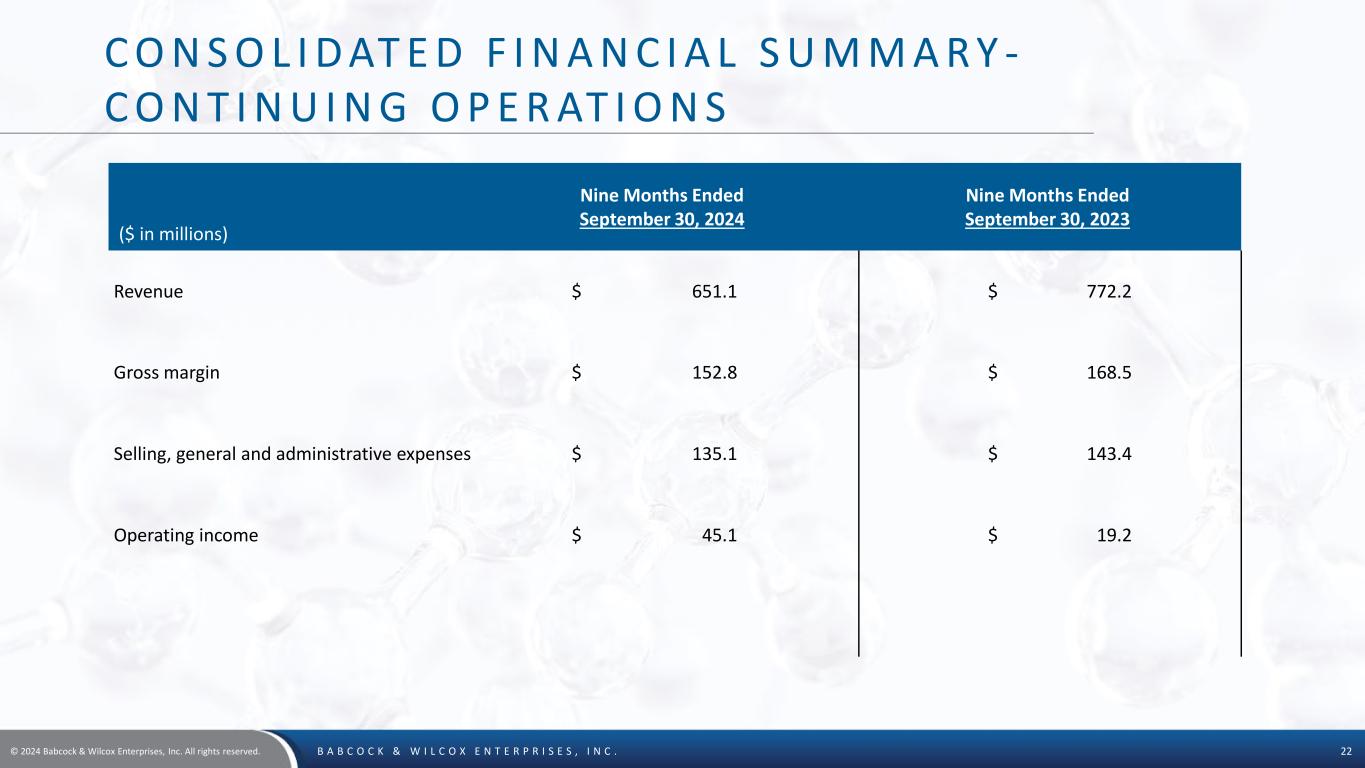 © 2024 Babcock & Wilcox Enterprises, Inc. All rights reserved. B A B C O C K & W I L C O X E N T E R P R I S E S , I N C . 22 C O N S O L I D AT E D F I N A N C I A L S U M M A R Y - C O N T I N U I N G O P E R AT I O N S ($ in millions) Nine Months Ended September 30, 2024 Nine Months Ended September 30, 2023 Revenue $ 651.1 $ 772.2 Gross margin $ 152.8 $ 168.5 Selling, general and administrative expenses $ 135.1 $ 143.4 Operating income $ 45.1 $ 19.2