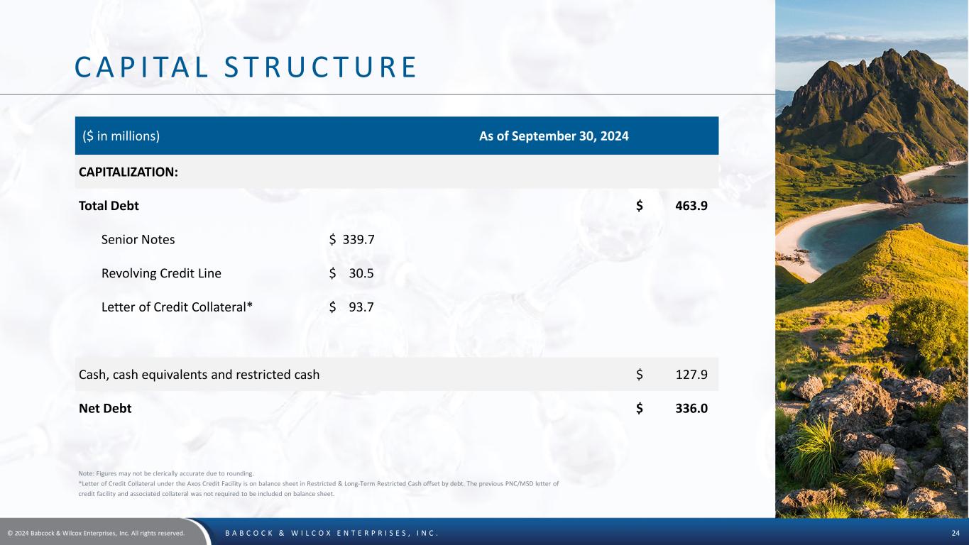© 2024 Babcock & Wilcox Enterprises, Inc. All rights reserved. B A B C O C K & W I L C O X E N T E R P R I S E S , I N C . 24 C A P I TA L S T R U C T U R E ($ in millions) As of September 30, 2024 CAPITALIZATION: Total Debt $ 463.9 Senior Notes $ 339.7 Revolving Credit Line $ 30.5 Letter of Credit Collateral* $ 93.7 Cash, cash equivalents and restricted cash $ 127.9 Net Debt $ 336.0 Note: Figures may not be clerically accurate due to rounding. *Letter of Credit Collateral under the Axos Credit Facility is on balance sheet in Restricted & Long-Term Restricted Cash offset by debt. The previous PNC/MSD letter of credit facility and associated collateral was not required to be included on balance sheet.