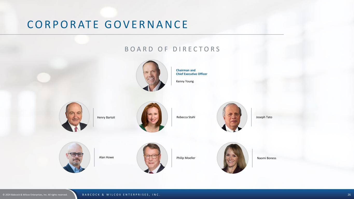 © 2024 Babcock & Wilcox Enterprises, Inc. All rights reserved. B A B C O C K & W I L C O X E N T E R P R I S E S , I N C . 25 L E A D E R S H I P T E A M Chairman and Chief Executive Officer Kenny Young Executive Vice President and Chief Financial Officer Lou Salamone Executive Vice President and Chief Operating Officer Jimmy B. Morgan Executive Vice President, General Counsel and Corporate Secretary John J. Dziewisz Chief Technology Officer Brandy Johnson Senior Vice President, Thermal Chris Riker Vice President, Corporate Operations Gillianne Hetrick Vice President, Corporate Development Sarah Serafin