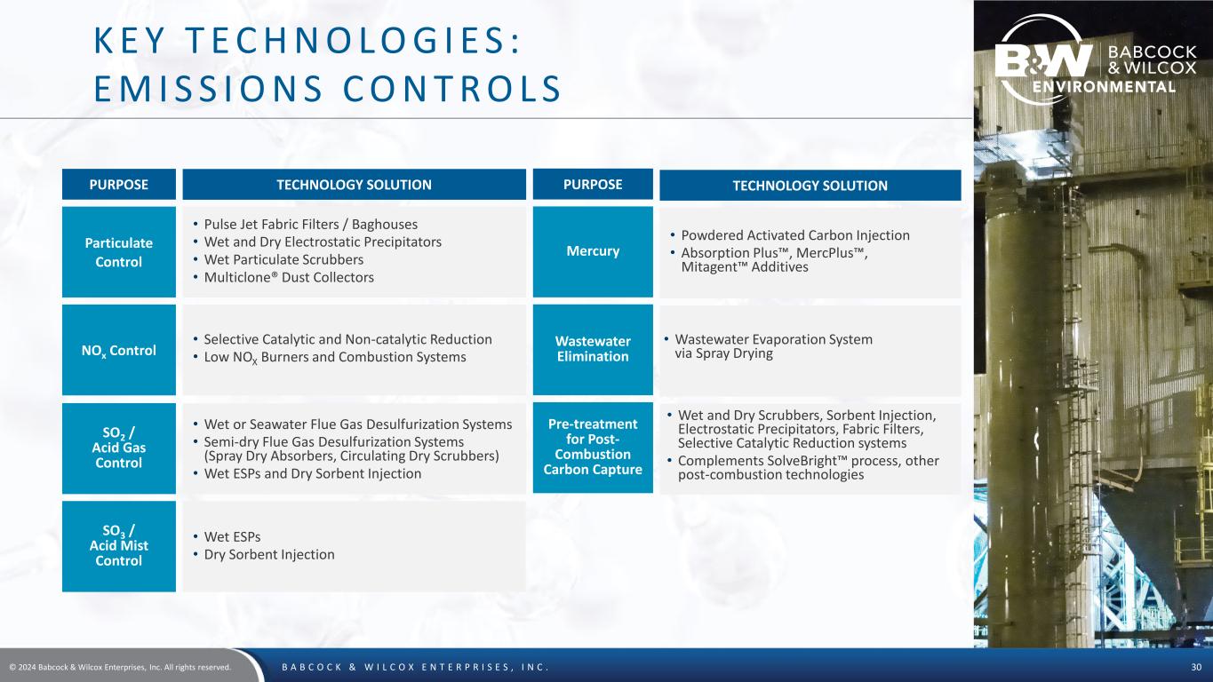 © 2024 Babcock & Wilcox Enterprises, Inc. All rights reserved. B A B C O C K & W I L C O X E N T E R P R I S E S , I N C . 29 K E Y T E C H N O L O G I E S : R E N E WA B L E C O M B U S T I O N G R AT E S • Large installed base with diverse set of customers • Grate design allows for high availability and long operational time, leading to reduced O&M cost • High thermal efficiency and low emissions • Fuel flexibility • Factory-assembled modules reduce field construction D Y N A G R A T E ® C O M B U S T I O N G R A T E A MARKET LEADER WITH DIFFERENTIATING TECHNOLOGY IN WASTE-TO-ENERGY SOLUTIONS