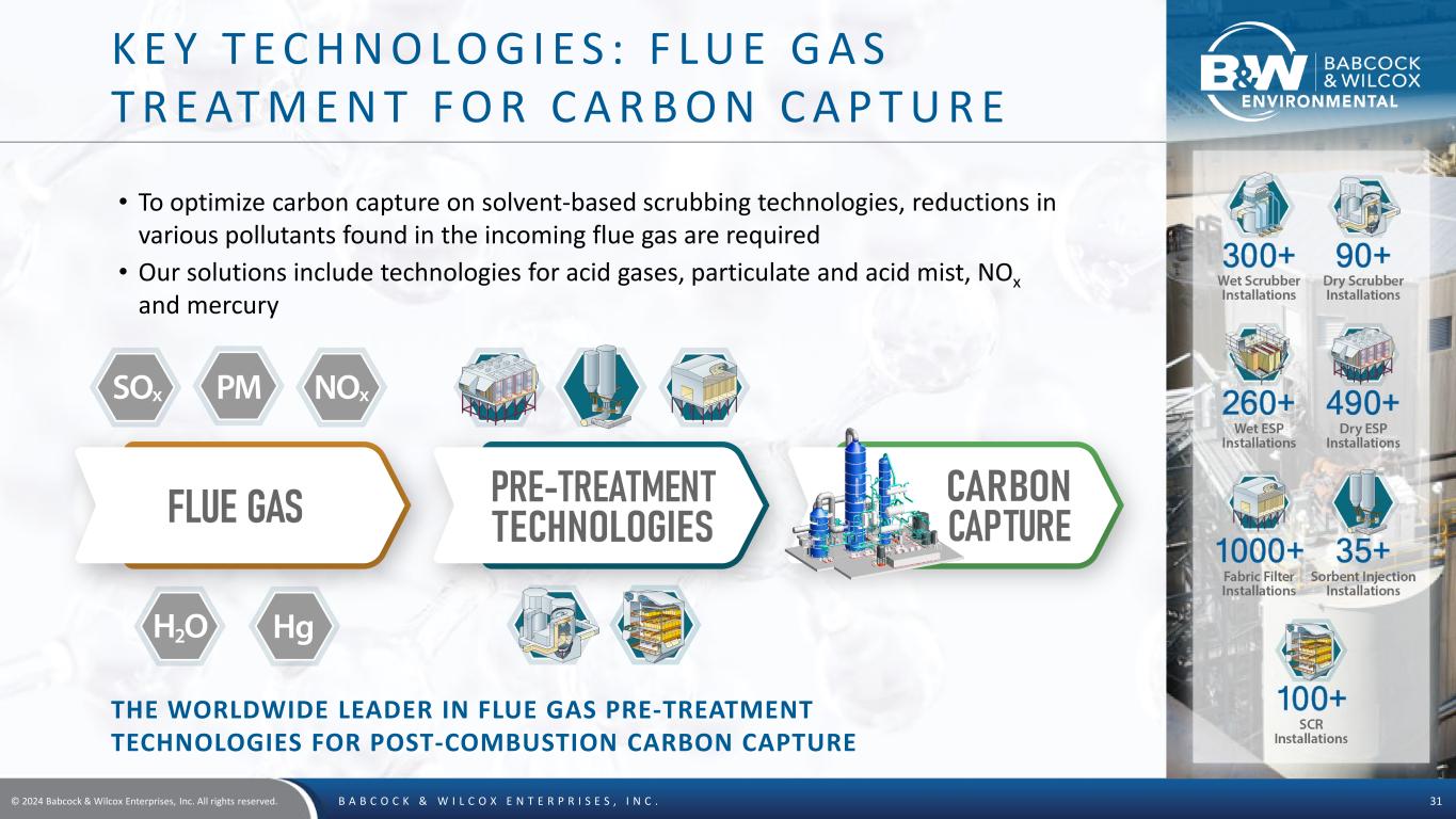 © 2024 Babcock & Wilcox Enterprises, Inc. All rights reserved. B A B C O C K & W I L C O X E N T E R P R I S E S , I N C . 30 K E Y T E C H N O L O G I E S : E M I S S I O N S C O N T R O L S • Wet ESPs • Dry Sorbent Injection SO3 / Acid Mist Control PURPOSE TECHNOLOGY SOLUTION Particulate Control • Pulse Jet Fabric Filters / Baghouses • Wet and Dry Electrostatic Precipitators • Wet Particulate Scrubbers • Multiclone® Dust Collectors • Selective Catalytic and Non-catalytic Reduction • Low NOX Burners and Combustion SystemsNOx Control • Wet or Seawater Flue Gas Desulfurization Systems • Semi-dry Flue Gas Desulfurization Systems (Spray Dry Absorbers, Circulating Dry Scrubbers) • Wet ESPs and Dry Sorbent Injection SO2 / Acid Gas Control PURPOSE TECHNOLOGY SOLUTION • Powdered Activated Carbon Injection • Absorption Plus™, MercPlus™, Mitagent™ Additives Mercury • Wastewater Evaporation System via Spray Drying Wastewater Elimination Pre-treatment for Post- Combustion Carbon Capture • Wet and Dry Scrubbers, Sorbent Injection, Electrostatic Precipitators, Fabric Filters, Selective Catalytic Reduction systems • Complements SolveBright™ process, other post-combustion technologies