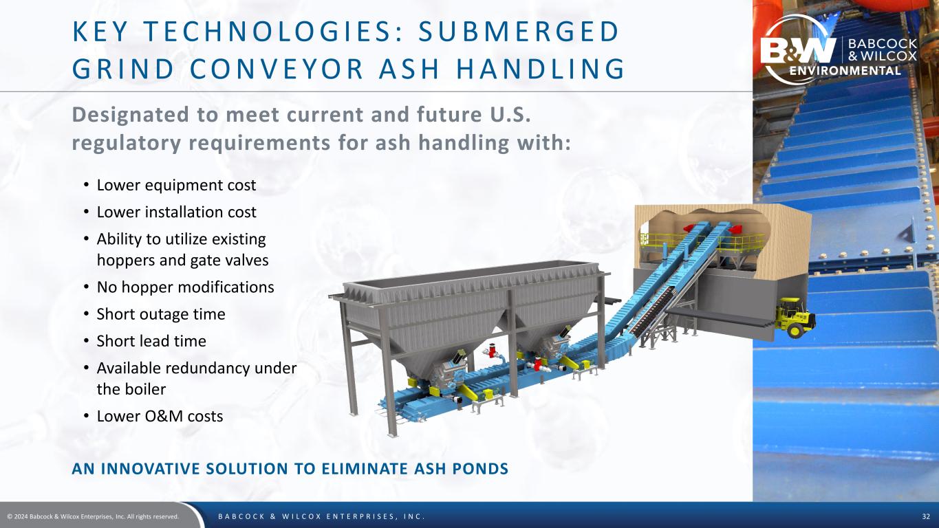 © 2024 Babcock & Wilcox Enterprises, Inc. All rights reserved. B A B C O C K & W I L C O X E N T E R P R I S E S , I N C . 31 K E Y T E C H N O L O G I E S : F L U E G A S T R E AT M E N T F O R C A R B O N C A P T U R E • To optimize carbon capture on solvent-based scrubbing technologies, reductions in various pollutants found in the incoming flue gas are required • Our solutions include technologies for acid gases, particulate and acid mist, NOx and mercury THE WORLDWIDE LEADER IN FLUE GAS PRE-TREATMENT TECHNOLOGIES FOR POST-COMBUSTION CARBON CAPTURE