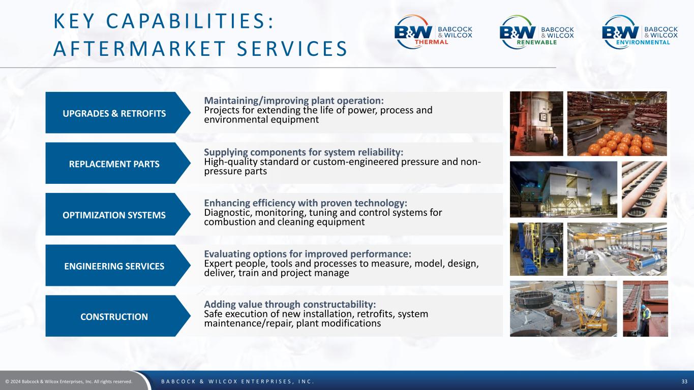 © 2024 Babcock & Wilcox Enterprises, Inc. All rights reserved. B A B C O C K & W I L C O X E N T E R P R I S E S , I N C . 33 K E Y C A PA B I L I T I E S : A F T E R M A R K E T S E R V I C E S Adding value through constructability: Safe execution of new installation, retrofits, system maintenance/repair, plant modificationsCONSTRUCTION OPTIMIZATION SYSTEMS Enhancing efficiency with proven technology: Diagnostic, monitoring, tuning and control systems for combustion and cleaning equipment UPGRADES & RETROFITS Maintaining/improving plant operation: Projects for extending the life of power, process and environmental equipment ENGINEERING SERVICES Evaluating options for improved performance: Expert people, tools and processes to measure, model, design, deliver, train and project manage REPLACEMENT PARTS Supplying components for system reliability: High-quality standard or custom-engineered pressure and non- pressure parts