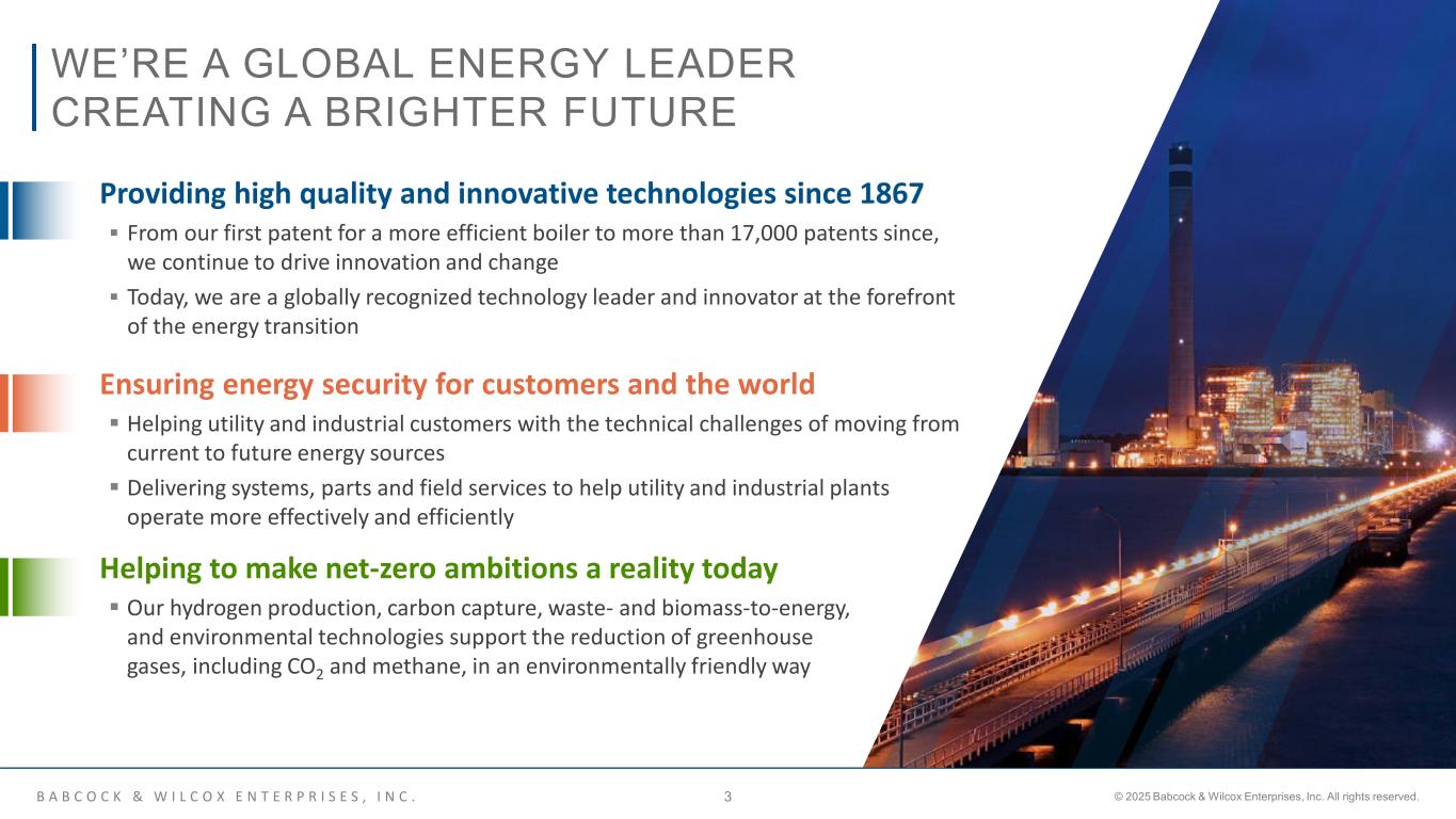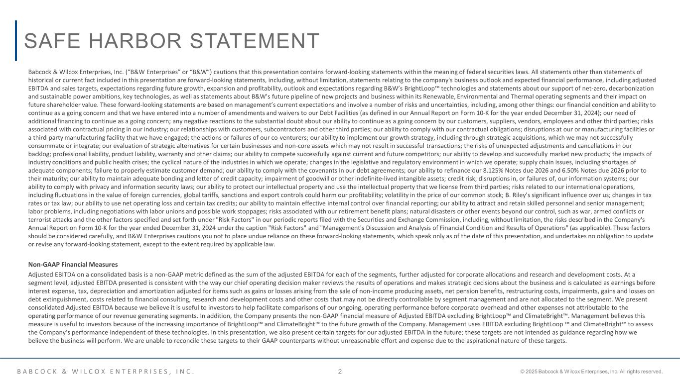 B A B C O C K & W I L C O X E N T E R P R I S E S , I N C . © 2025 Babcock & Wilcox Enterprises, Inc. All rights reserved.2 Babcock & Wilcox Enterprises, Inc. (“B&W Enterprises” or “B&W”) cautions that this presentation contains forward-looking statements within the meaning of federal securities laws. All statements other than statements of historical or current fact included in this presentation are forward-looking statements, including, without limitation, statements relating to the company's business outlook and expected financial performance, including adjusted EBITDA and sales targets, expectations regarding future growth, expansion and profitability, outlook and expectations regarding B&W’s BrightLoop™ technologies and statements about our support of net-zero, decarbonization and sustainable power ambitions, key technologies, as well as statements about B&W’s future pipeline of new projects and business within its Renewable, Environmental and Thermal operating segments and their impact on future shareholder value. These forward-looking statements are based on management’s current expectations and involve a number of risks and uncertainties, including, among other things: our financial condition and ability to continue as a going concern and that we have entered into a number of amendments and waivers to our Debt Facilities (as defined in our Annual Report on Form 10-K for the year ended December 31, 2024); our need of additional financing to continue as a going concern; any negative reactions to the substantial doubt about our ability to continue as a going concern by our customers, suppliers, vendors, employees and other third parties; risks associated with contractual pricing in our industry; our relationships with customers, subcontractors and other third parties; our ability to comply with our contractual obligations; disruptions at our or manufacturing facilities or a third-party manufacturing facility that we have engaged; the actions or failures of our co-venturers; our ability to implement our growth strategy, including through strategic acquisitions, which we may not successfully consummate or integrate; our evaluation of strategic alternatives for certain businesses and non-core assets which may not result in successful transactions; the risks of unexpected adjustments and cancellations in our backlog; professional liability, product liability, warranty and other claims; our ability to compete successfully against current and future competitors; our ability to develop and successfully market new products; the impacts of industry conditions and public health crises; the cyclical nature of the industries in which we operate; changes in the legislative and regulatory environment in which we operate; supply chain issues, including shortages of adequate components; failure to properly estimate customer demand; our ability to comply with the covenants in our debt agreements; our ability to refinance our 8.125% Notes due 2026 and 6.50% Notes due 2026 prior to their maturity; our ability to maintain adequate bonding and letter of credit capacity; impairment of goodwill or other indefinite-lived intangible assets; credit risk; disruptions in, or failures of, our information systems; our ability to comply with privacy and information security laws; our ability to protect our intellectual property and use the intellectual property that we license from third parties; risks related to our international operations, including fluctuations in the value of foreign currencies, global tariffs, sanctions and export controls could harm our profitability; volatility in the price of our common stock; B. Riley’s significant influence over us; changes in tax rates or tax law; our ability to use net operating loss and certain tax credits; our ability to maintain effective internal control over financial reporting; our ability to attract and retain skilled personnel and senior management; labor problems, including negotiations with labor unions and possible work stoppages; risks associated with our retirement benefit plans; natural disasters or other events beyond our control, such as war, armed conflicts or terrorist attacks and the other factors specified and set forth under "Risk Factors" in our periodic reports filed with the Securities and Exchange Commission, including, without limitation, the risks described in the Company's Annual Report on Form 10-K for the year ended December 31, 2024 under the caption "Risk Factors" and "Management's Discussion and Analysis of Financial Condition and Results of Operations" (as applicable). These factors should be considered carefully, and B&W Enterprises cautions you not to place undue reliance on these forward-looking statements, which speak only as of the date of this presentation, and undertakes no obligation to update or revise any forward-looking statement, except to the extent required by applicable law. ​ Non-GAAP Financial Measures Adjusted EBITDA on a consolidated basis is a non-GAAP metric defined as the sum of the adjusted EBITDA for each of the segments, further adjusted for corporate allocations and research and development costs. At a segment level, adjusted EBITDA presented is consistent with the way our chief operating decision maker reviews the results of operations and makes strategic decisions about the business and is calculated as earnings before interest expense, tax, depreciation and amortization adjusted for items such as gains or losses arising from the sale of non-income producing assets, net pension benefits, restructuring costs, impairments, gains and losses on debt extinguishment, costs related to financial consulting, research and development costs and other costs that may not be directly controllable by segment management and are not allocated to the segment. We present consolidated Adjusted EBITDA because we believe it is useful to investors to help facilitate comparisons of our ongoing, operating perf