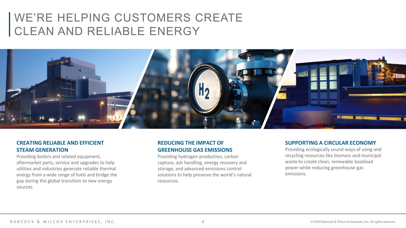 B A B C O C K & W I L C O X E N T E R P R I S E S , I N C . © 2025 Babcock & Wilcox Enterprises, Inc. All rights reserved.3 Providing high quality and innovative technologies since 1867  From our first patent for a more efficient boiler to more than 17,000 patents since, we continue to drive innovation and change​  Today, we are a globally recognized technology leader and innovator at the forefront of the energy transition​​ WE’RE A GLOBAL ENERGY LEADER CREATING A BRIGHTER FUTURE Ensuring energy security for customers and the world​  Helping utility and industrial customers with the technical challenges of moving from current to future energy sources​  Delivering systems, parts and field services to help utility and industrial plants operate more effectively and efficiently Helping to make net-zero ambitions a reality today​  Our hydrogen production, carbon capture, waste- and biomass-to-energy, and environmental technologies support the reduction of greenhouse gases, including CO2 and methane, in an environmentally friendly way