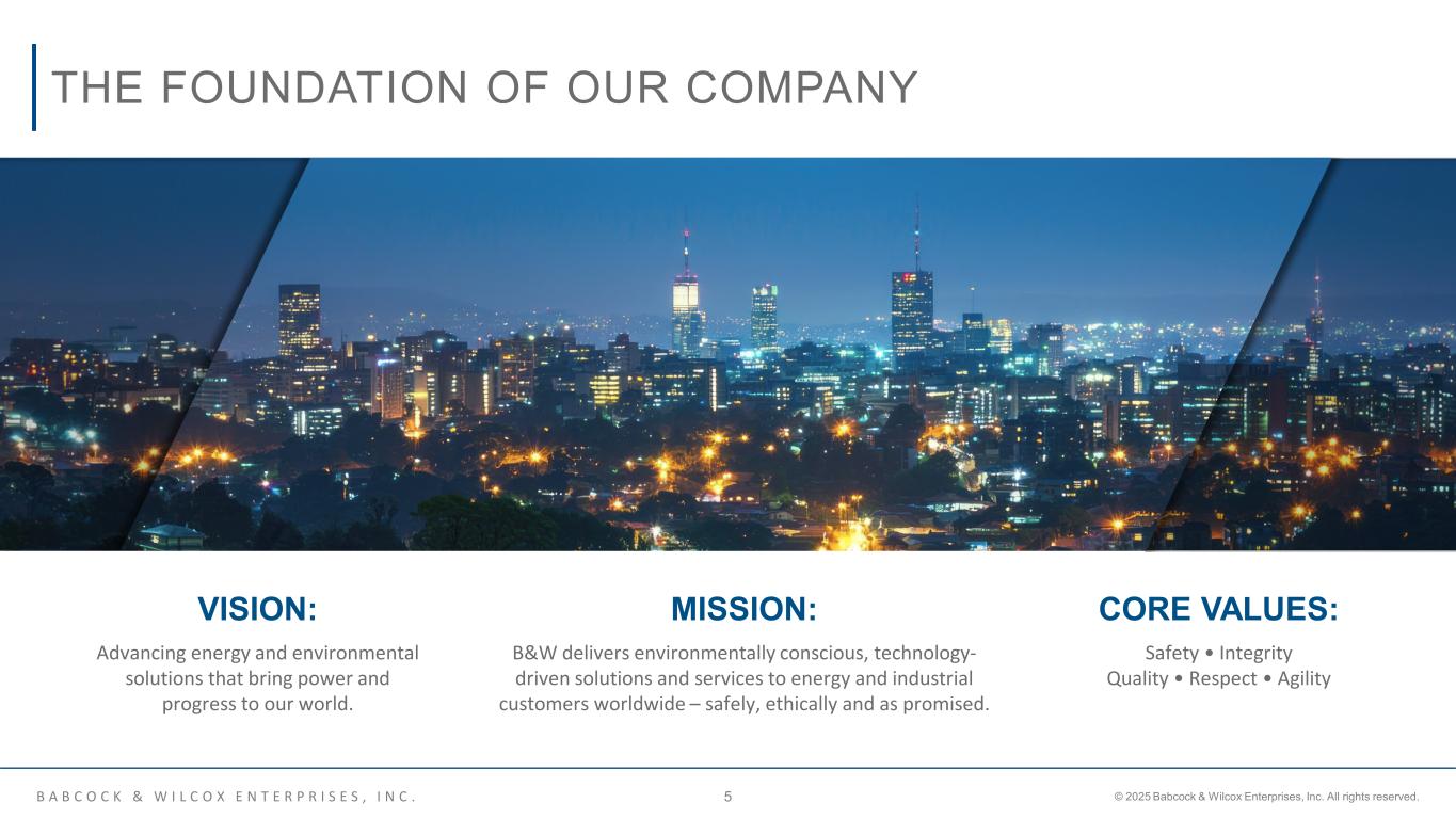 B A B C O C K & W I L C O X E N T E R P R I S E S , I N C . © 2025 Babcock & Wilcox Enterprises, Inc. All rights reserved.4 WE’RE HELPING CUSTOMERS CREATE CLEAN AND RELIABLE ENERGY SUPPORTING A CIRCULAR ECONOMY Providing ecologically sound ways of using and recycling resources like biomass and municipal waste to create clean, renewable baseload power while reducing greenhouse gas emissions. REDUCING THE IMPACT OF GREENHOUSE GAS EMISSIONS Providing hydrogen production, carbon capture, ash handling, energy recovery and storage, and advanced emissions control solutions to help preserve the world’s natural resources. CREATING RELIABLE AND EFFICIENT STEAM GENERATION Providing boilers and related equipment, aftermarket parts, service and upgrades to help utilities and industries generate reliable thermal energy from a wide range of fuels and bridge the gap during the global transition to new energy sources.