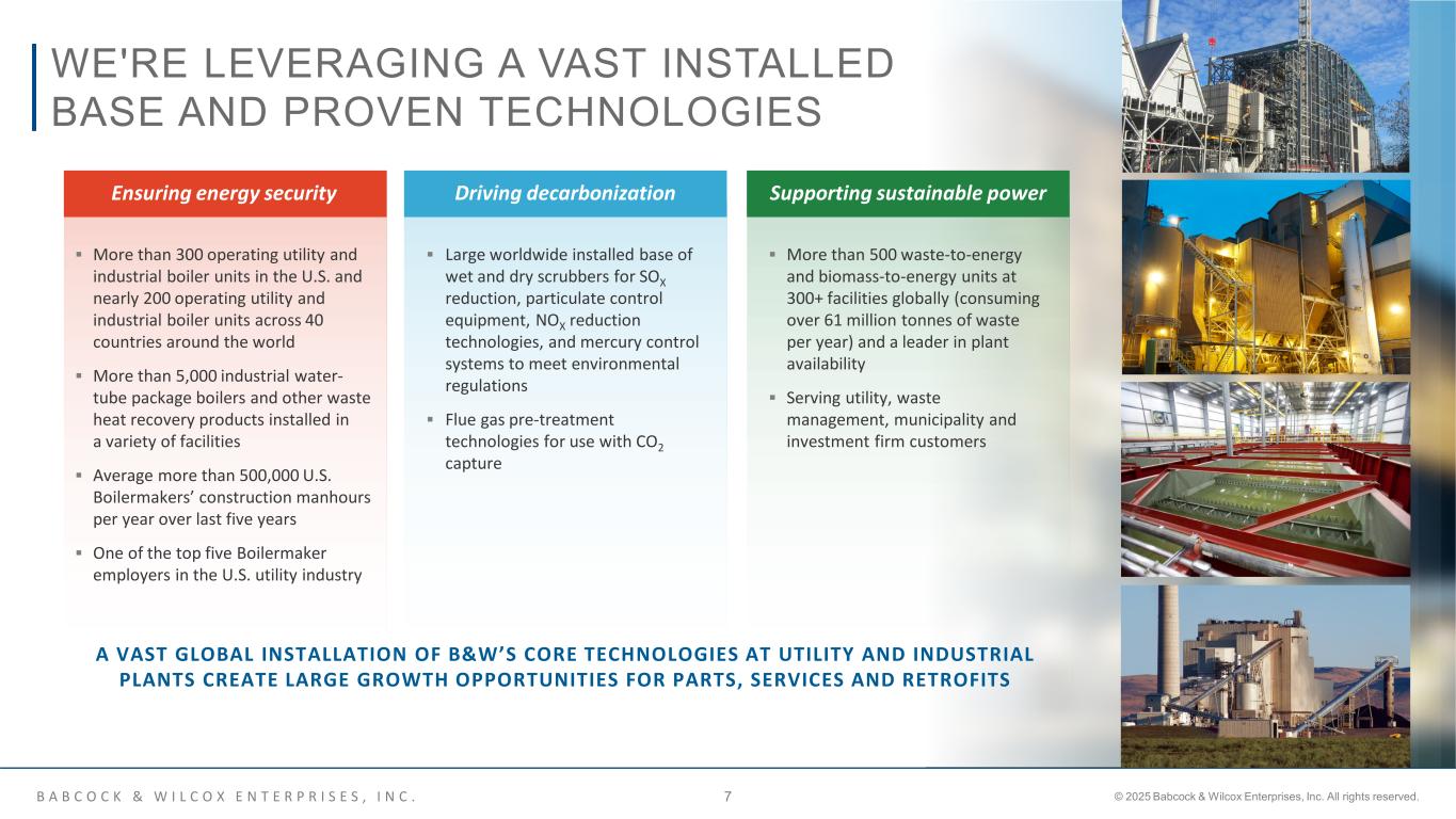 B A B C O C K & W I L C O X E N T E R P R I S E S , I N C . © 2025 Babcock & Wilcox Enterprises, Inc. All rights reserved.6  Increase focus on large thermal-growth projects and higher-margin aftermarket parts and services and continue to expand geographical presence in support of these markets  Leverage our advanced thermal technologies to support fuel switching projects  Convert anticipated global pipeline of more than $7.6 billion of identified project opportunities into bookings, including over $2.6 billion in BrightLoop™ and ClimateBright™ opportunities  Continue to implement up to $30 million in cost reductions associated with strategic realignment  Strengthen balance sheet and evaluate strategic alternatives for non- strategic assets  Utilize state and federal project-level financing to accelerate deployment of BrightLoop technology  Execute paid front-end engineering and design studies to further drive ClimateBright and BrightLoop technology bookings WE’RE STRENGTHENING OUR BUSINESS TO ACHIEVE PROFITABLE GROWTH