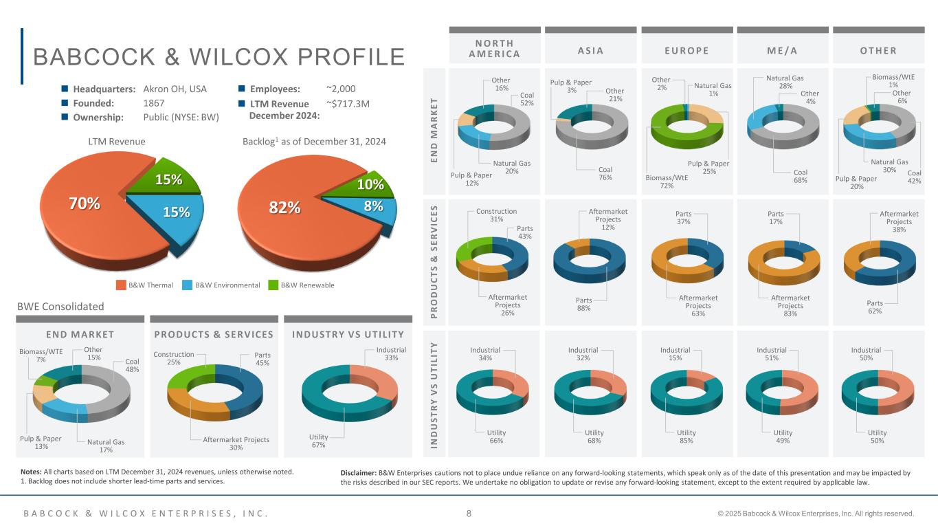 B A B C O C K & W I L C O X E N T E R P R I S E S , I N C . © 2025 Babcock & Wilcox Enterprises, Inc. All rights reserved.7 WE'RE LEVERAGING A VAST INSTALLED BASE AND PROVEN TECHNOLOGIES  More than 300 operating utility and industrial boiler units in the U.S. and nearly 200 operating utility and industrial boiler units across 40 countries around the world  More than 5,000 industrial water- tube package boilers and other waste heat recovery products installed in a variety of facilities  Average more than 500,000 U.S. Boilermakers’ construction manhours per year over last five years  One of the top five Boilermaker employers in the U.S. utility industry  More than 500 waste-to-energy and biomass-to-energy units at 300+ facilities globally (consuming over 61 million tonnes of waste per year) and a leader in plant availability  Serving utility, waste management, municipality and investment firm customers  Large worldwide installed base of wet and dry scrubbers for SOX reduction, particulate control equipment, NOX reduction technologies, and mercury control systems to meet environmental regulations  Flue gas pre-treatment technologies for use with CO2 capture A VAST GLOBAL INSTALLATION OF B&W’S CORE TECHNOLOGIES AT UTILITY AND INDUSTRIAL PLANTS CREATE LARGE GROWTH OPPORTUNITIES FOR PARTS, SERVICES AND RETROFITS Ensuring energy security Driving decarbonization Supporting sustainable power