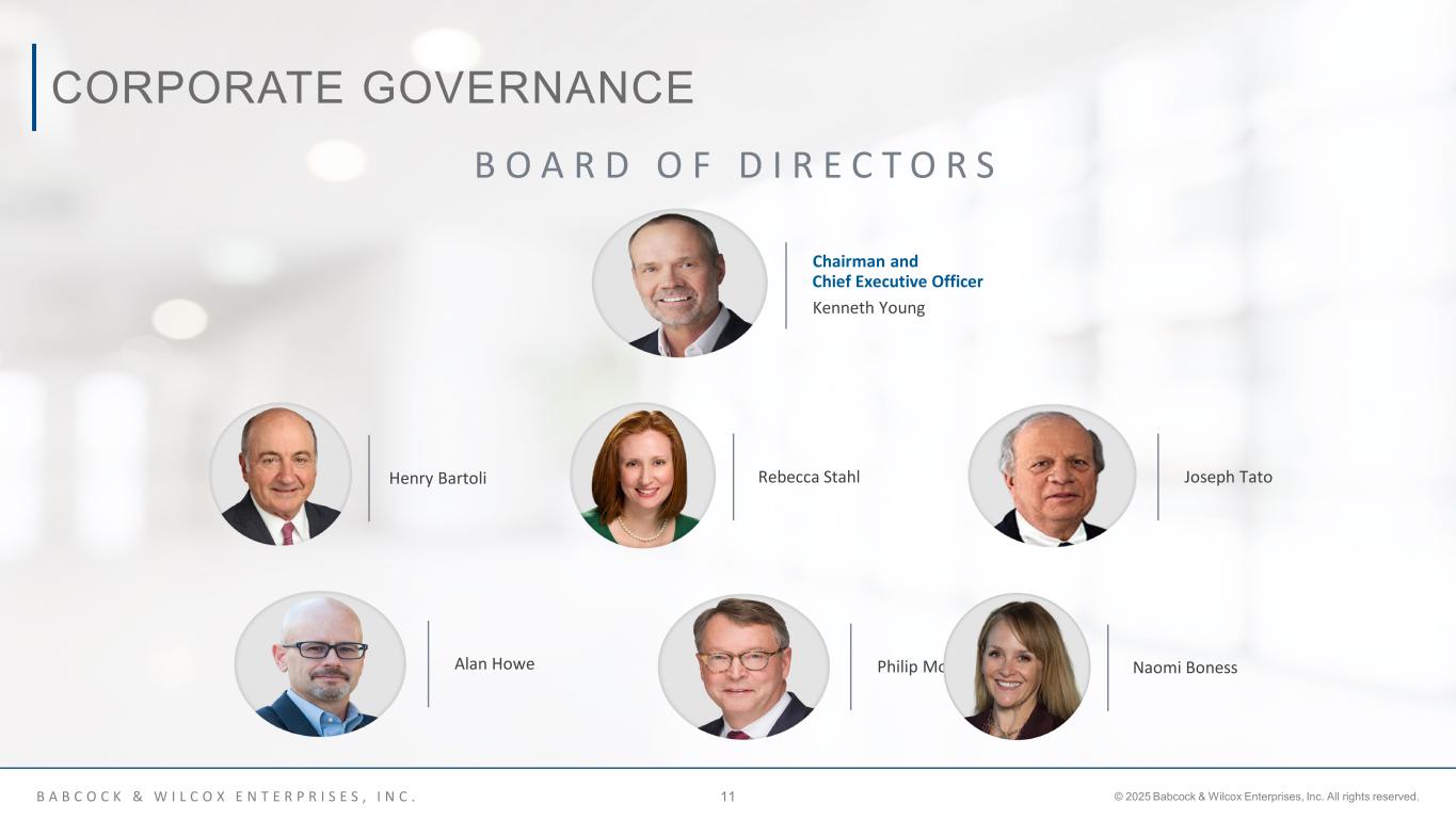 B A B C O C K & W I L C O X E N T E R P R I S E S , I N C . © 2025 Babcock & Wilcox Enterprises, Inc. All rights reserved.10 LEADERSHIP TEAM Executive Vice President and Chief Financial Officer Cameron Frymyer Executive Vice President, General Counsel and Corporate Secretary John J. Dziewisz Chief Technology Officer Brandy Johnson Chairman and Chief Executive Officer Kenneth Young Executive Vice President and Chief Operating Officer Chris Riker Executive Vice President and Chief Commercial Officer Jimmy B. Morgan Senior Vice President, Corporate Operations Gillianne Hetrick Vice President, Corporate Development Sarah Serafin Non-Executive Advisor Dr. Homaira Akbari
