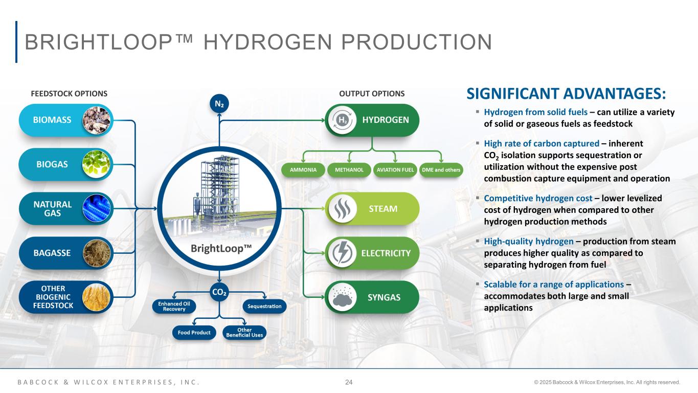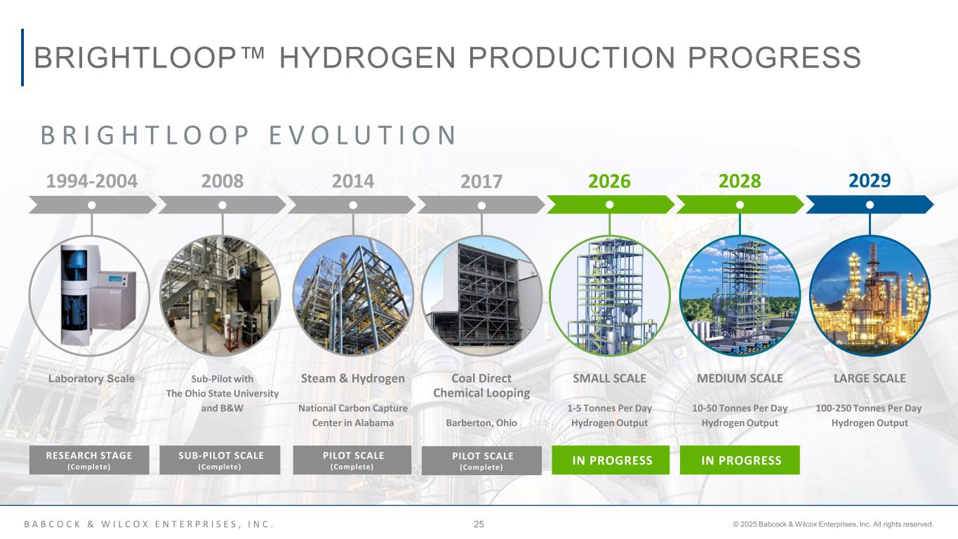 B A B C O C K & W I L C O X E N T E R P R I S E S , I N C . © 2025 Babcock & Wilcox Enterprises, Inc. All rights reserved.24 BRIGHTLOOP™ HYDROGEN PRODUCTION FEEDSTOCK OPTIONS OUTPUT OPTIONS SIGNIFICANT ADVANTAGES:  Hydrogen from solid fuels – can utilize a variety of solid or gaseous fuels as feedstock  High rate of carbon captured – inherent CO2 isolation supports sequestration or utilization without the expensive post combustion capture equipment and operation  Competitive hydrogen cost – lower levelized cost of hydrogen when compared to other hydrogen production methods  High-quality hydrogen – production from steam produces higher quality as compared to separating hydrogen from fuel  Scalable for a range of applications – accommodates both large and small applications
