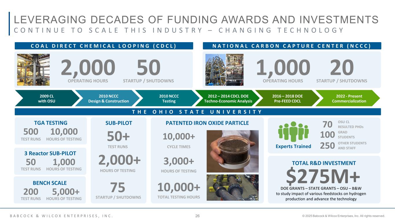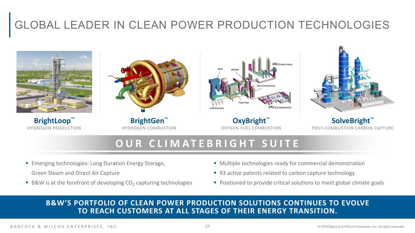 B A B C O C K & W I L C O X E N T E R P R I S E S , I N C . © 2025 Babcock & Wilcox Enterprises, Inc. All rights reserved.26 LEVERAGING DECADES OF FUNDING AWARDS AND INVESTMENTS C O A L D I R E C T C H E M I C A L L O O P I N G ( C D C L ) N A T I O N A L C A R B O N C A P T U R E C E N T E R ( N C C C ) T H E O H I O S T A T E U N I V E R S I T Y OPERATING HOURS 2,000 STARTUP / SHUTDOWNS 50 OPERATING HOURS 1,000 STARTUP / SHUTDOWNS 20 $275M+ PATENTED IRON OXIDE PARTICLETGA TESTING TEST RUNS HOURS OF TESTING 500 10,000 BENCH SCALE TEST RUNS HOURS OF TESTING 200 5,000+ 3 Reactor SUB-PILOT TEST RUNS HOURS OF TESTING 50 1,000 SUB-PILOT TEST RUNS 50+ HOURS OF TESTING 2,000+ STARTUP / SHUTDOWNS 75 TOTAL R&D INVESTMENT CYCLE TIMES 10,000+ HOURS OF TESTING 3,000+ TOTAL TESTING HOURS 10,000+ DOE GRANTS – STATE GRANTS – OSU – B&W to study impact of various feedstocks on hydrogen production and advance the technology OSU CL RESULTED PHDs GRAD STUDENTS 70 100 OTHER STUDENTS AND STAFF250Experts Trained 2016 – 2018 DOE Pre-FEED CDCL 2009 CL with OSU 2010 NCCC Testing 2012 – 2014 CDCL DOE Techno-Economic Analysis 2010 NCCC Design & Construction 2022 - Present Commercialization C O N T I N U E T O S C A L E T H I S I N D U S T R Y – C H A N G I N G T E C H N O L O G Y
