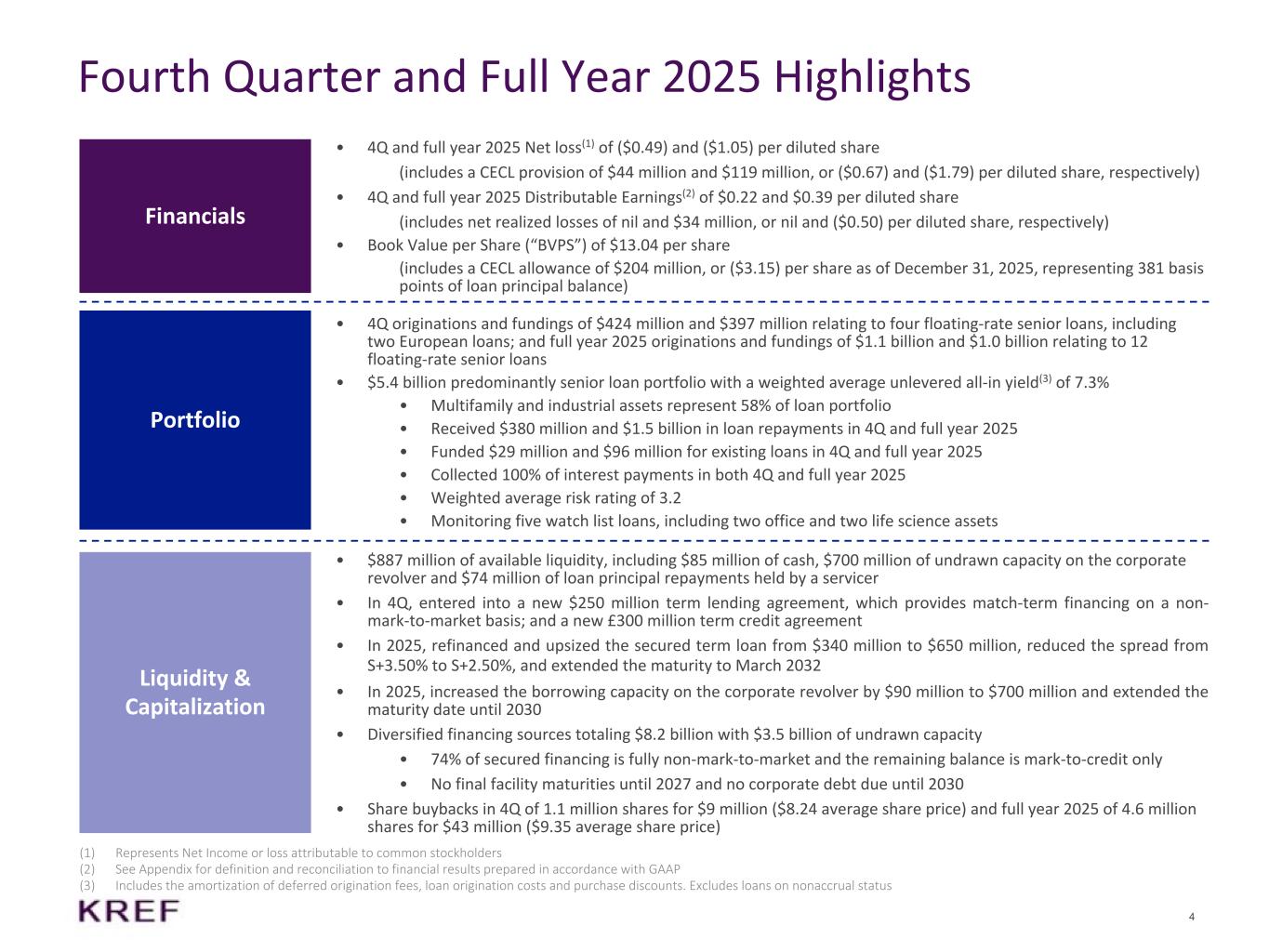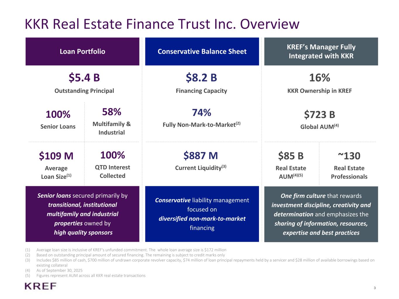2 Legal Disclosures This presentation has been prepared for KKR Real Estate Finance Trust Inc. (NYSE: KREF) for the benefit of its stockholders. This presentation is solely for informational purposes in connection with evaluating the business, operations and financial results of KKR Real Estate Finance Trust Inc. and its subsidiaries (collectively, "KREF“ or the “Company”). This presentation is not and shall not be construed as an offer to purchase or sell, or the solicitation of an offer to purchase or sell, any securities, any investment advice or any other service by KREF. Nothing in this presentation constitutes the provision of any tax, accounting, financial, investment, regulatory, legal or other advice by KREF or its advisors. This presentation may not be referenced, quoted or linked by website by any third party, in whole or in part, except as agreed to in writing by KREF. This presentation contains forward-looking statements within the meaning of Section 27A of the Securities Act of 1933, as amended, and Section 21E of the Securities Exchange Act of 1934, as amended, which reflect the Company’s current views with respect to, among other things, its future operations and financial performance. You can identify these forward looking statements by the use of words such as “outlook,” “believe,” “expect,” “potential,” “continue,” “may,” “should,” “seek,” “approximately,” “predict,” “intend,” “will,” “plan,” “estimate,” “anticipate,” the negative version of these words, other comparable words or other statements that do not relate strictly to historical or factual matters. By their nature, forward-looking statements speak only as of the date they are made, are not statements of historical fact or guarantees of future performance and are subject to risks, uncertainties, assumptions or changes in circumstances that are difficult to predict or quantify. The forward-looking statements are based on the Company’s beliefs, assumptions and expectations, taking into account all information currently available to it. These beliefs, assumptions and expectations can change as a result of many possible events or factors, not all of which are known to the Company or are within its control. Such forward-looking statements are subject to various risks and uncertainties, including, among other things: the general political, economic, competitive, and other conditions in the United States and in any foreign jurisdictions in which we invest; global economic trends and conditions, including heightened inflation, slower growth or recession, changes to fiscal and monetary policy, fluctuations in interest rates and credit spreads, labor shortages, currency fluctuations and challenges in global supply chains; deterioration in the performance of the properties securing our investments; difficulty accessing financing or raising capital; and the risks, uncertainties and factors set forth under Part I-Item 1A. “Risk Factors” of the Company’s Annual Report on Form 10-K for the fiscal year ended December 31, 2024, as such factors may be updated from time to time in the Company’s periodic filings with the SEC, which are accessible on the SEC’s website at www.sec.gov. Accordingly, there are or will be important factors that could cause actual outcomes or results to differ materially from those indicated in this release. These factors should not be construed as exhaustive and should be read in conjunction with the other cautionary statements and information included in this release and in the Company’s filings with the SEC. All forward-looking statements in this release speak only as of the date of this release. The Company undertakes no obligation to publicly update or review any forward-looking statements, whether as a result of new information, future developments or otherwise, except as required by law. All forward looking statements in this presentation speak only as of February 3, 2026. KREF undertakes no obligation to publicly update or review any forward-looking statements, whether as a result of new information, future developments or otherwise, except as required by law. All financial information in this presentation is as of December 31, 2025 unless otherwise indicated. This presentation also includes non-GAAP financial measures, including Distributable Earnings and Distributable Earnings per Diluted Share. Such non-GAAP financial measures should be considered only as supplemental to, and not as superior to, financial measures prepared in accordance with U.S. GAAP. Please refer to the Appendix of this presentation for a reconciliation of the non-GAAP financial measures included in this presentation to the most directly comparable financial measures prepared in accordance with U.S. GAAP.