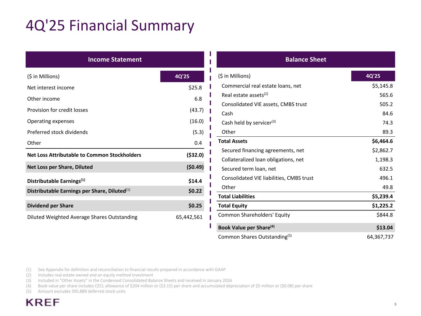 4 • 4Q and full year 2025 Net loss(1) of ($0.49) and ($1.05) per diluted share (includes a CECL provision of $44 million and $119 million, or ($0.67) and ($1.79) per diluted share, respectively) • 4Q and full year 2025 Distributable Earnings(2) of $0.22 and $0.39 per diluted share (includes net realized losses of nil and $34 million, or nil and ($0.50) per diluted share, respectively) • Book Value per Share (“BVPS”) of $13.04 per share (includes a CECL allowance of $204 million, or ($3.15) per share as of December 31, 2025, representing 381 basis points of loan principal balance) Fourth Quarter and Full Year 2025 Highlights (1) Represents Net Income or loss attributable to common stockholders (2) See Appendix for definition and reconciliation to financial results prepared in accordance with GAAP (3) Includes the amortization of deferred origination fees, loan origination costs and purchase discounts. Excludes loans on nonaccrual status • 4Q originations and fundings of $424 million and $397 million relating to four floating-rate senior loans, including two European loans; and full year 2025 originations and fundings of $1.1 billion and $1.0 billion relating to 12 floating-rate senior loans • $5.4 billion predominantly senior loan portfolio with a weighted average unlevered all-in yield(3) of 7.3% • Multifamily and industrial assets represent 58% of loan portfolio • Received $380 million and $1.5 billion in loan repayments in 4Q and full year 2025 • Funded $29 million and $96 million for existing loans in 4Q and full year 2025 • Collected 100% of interest payments in both 4Q and full year 2025 • Weighted average risk rating of 3.2 • Monitoring five watch list loans, including two office and two life science assets Financials Portfolio Liquidity & Capitalization • $887 million of available liquidity, including $85 million of cash, $700 million of undrawn capacity on the corporate revolver and $74 million of loan principal repayments held by a servicer • In 4Q, entered into a new $250 million term lending agreement, which provides match-term financing on a non- mark-to-market basis; and a new £300 million term credit agreement • In 2025, refinanced and upsized the secured term loan from $340 million to $650 million, reduced the spread from S+3.50% to S+2.50%, and extended the maturity to March 2032 • In 2025, increased the borrowing capacity on the corporate revolver by $90 million to $700 million and extended the maturity date until 2030 • Diversified financing sources totaling $8.2 billion with $3.5 billion of undrawn capacity • 74% of secured financing is fully non-mark-to-market and the remaining balance is mark-to-credit only • No final facility maturities until 2027 and no corporate debt due until 2030 • Share buybacks in 4Q of 1.1 million shares for $9 million ($8.24 average share price) and full year 2025 of 4.6 million shares for $43 million ($9.35 average share price)
