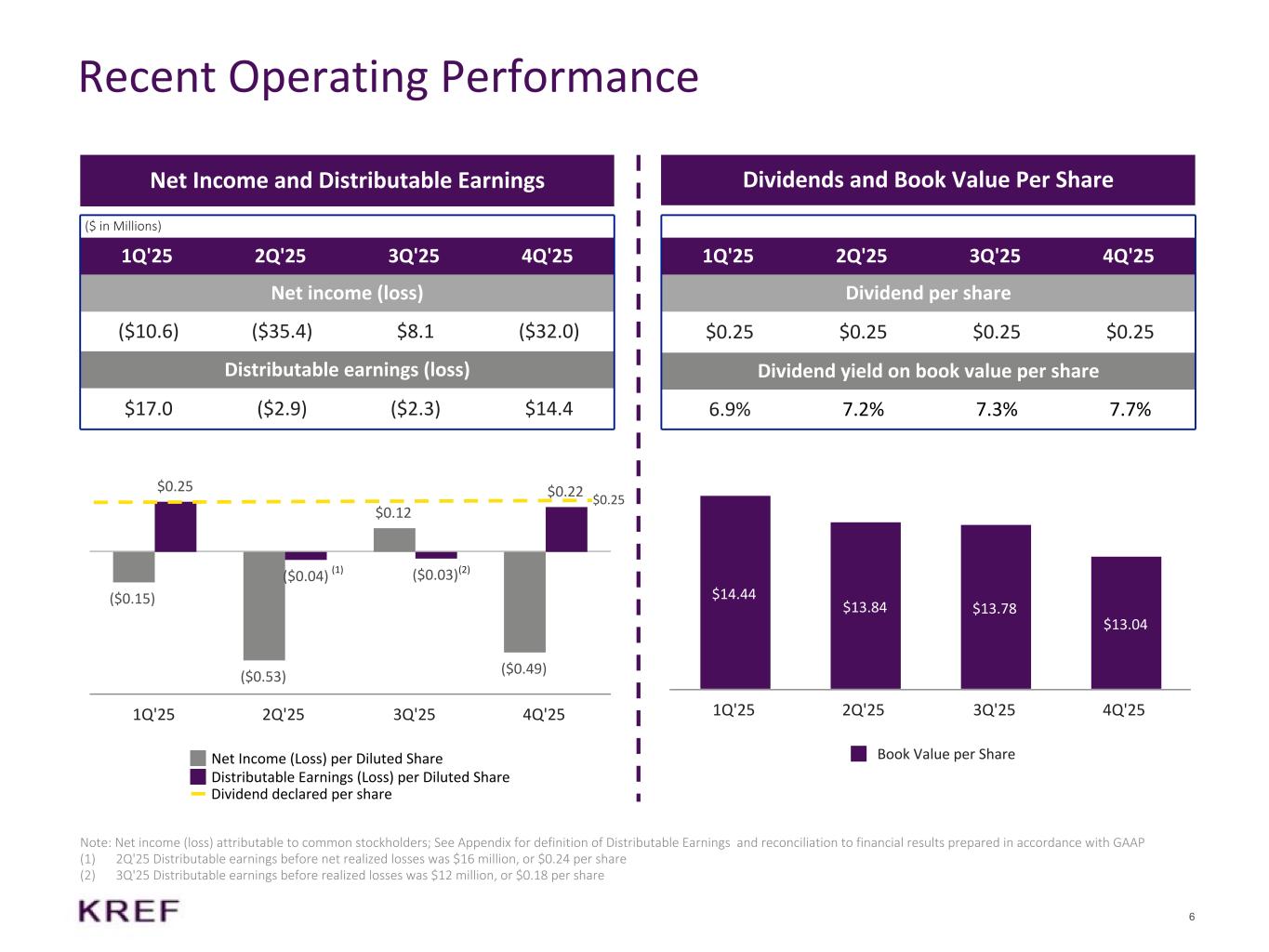 5 4Q'25 Financial Summary (1) See Appendix for definition and reconciliation to financial results prepared in accordance with GAAP (2) Includes real estate owned and an equity method investment (3) Included in “Other Assets” in the Condensed Consolidated Balance Sheets and received in January 2026 (4) Book value per share includes CECL allowance of $204 million or ($3.15) per share and accumulated depreciation of $5 million or ($0.08) per share (5) Amount excludes 395,889 deferred stock units Income Statement ($ in Millions) 4Q'25 Net interest income $25.8 Other income 6.8 Provision for credit losses (43.7) Operating expenses (16.0) Preferred stock dividends (5.3) Other 0.4 Net Loss Attributable to Common Stockholders ($32.0) Net Loss per Share, Diluted ($0.49) Distributable Earnings(1) $14.4 Distributable Earnings per Share, Diluted(1) $0.22 Dividend per Share $0.25 Diluted Weighted Average Shares Outstanding 65,442,561 Balance Sheet ($ in Millions) 4Q'25 Commercial real estate loans, net $5,145.8 Real estate assets(2) 565.6 Consolidated VIE assets, CMBS trust 505.2 Cash 84.6 Cash held by servicer(3) 74.3 Other 89.3 Total Assets $6,464.6 Secured financing agreements, net $2,862.7 Collateralized loan obligations, net 1,198.3 Secured term loan, net 632.5 Consolidated VIE liabilities, CMBS trust 496.1 Other 49.8 Total Liabilities $5,239.4 Total Equity $1,225.2 Common Shareholders' Equity $844.8 Book Value per Share(4) $13.04 Common Shares Outstanding(5) 64,367,737