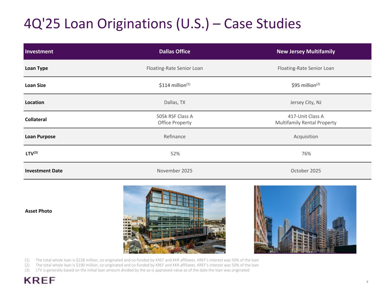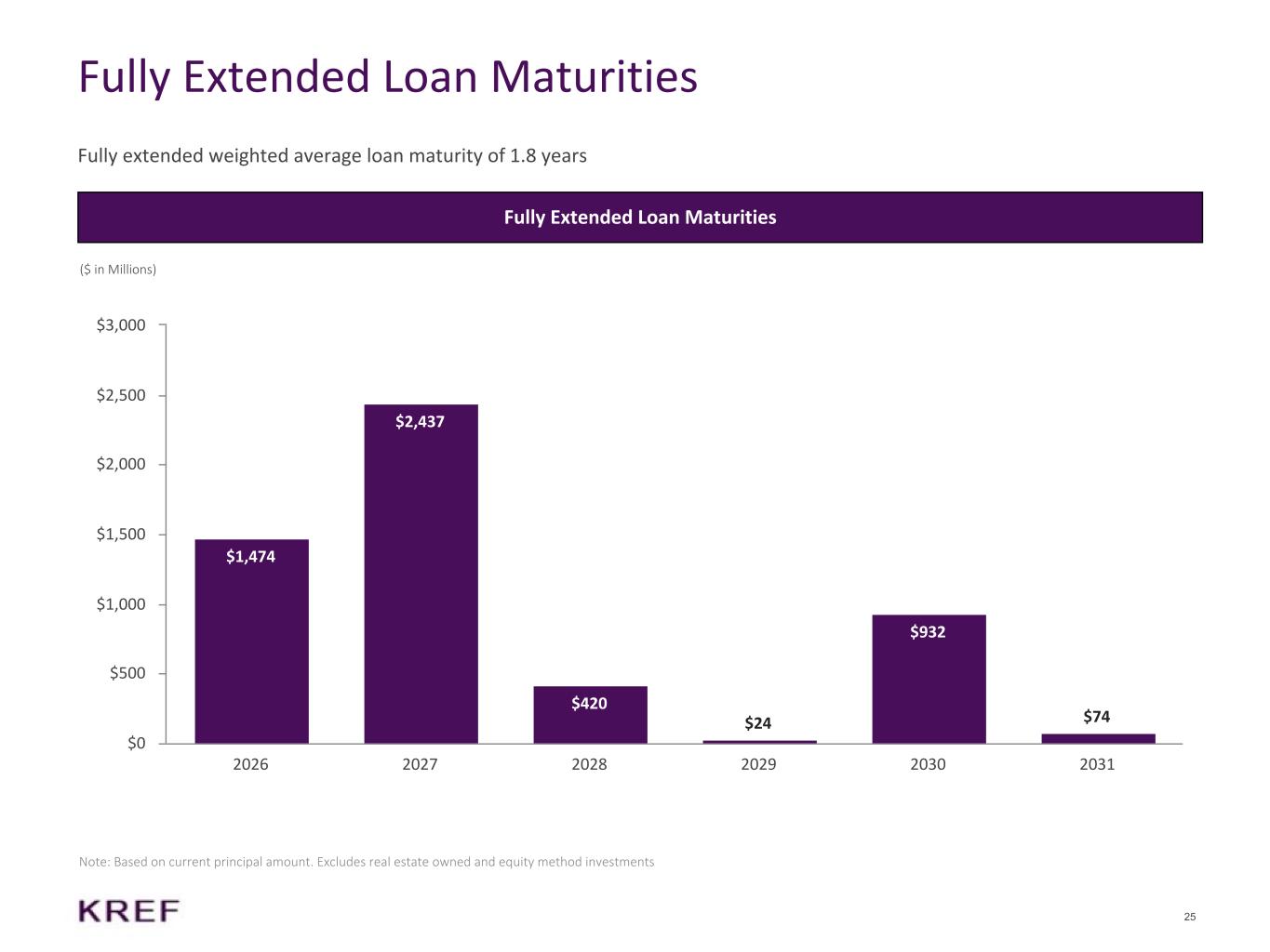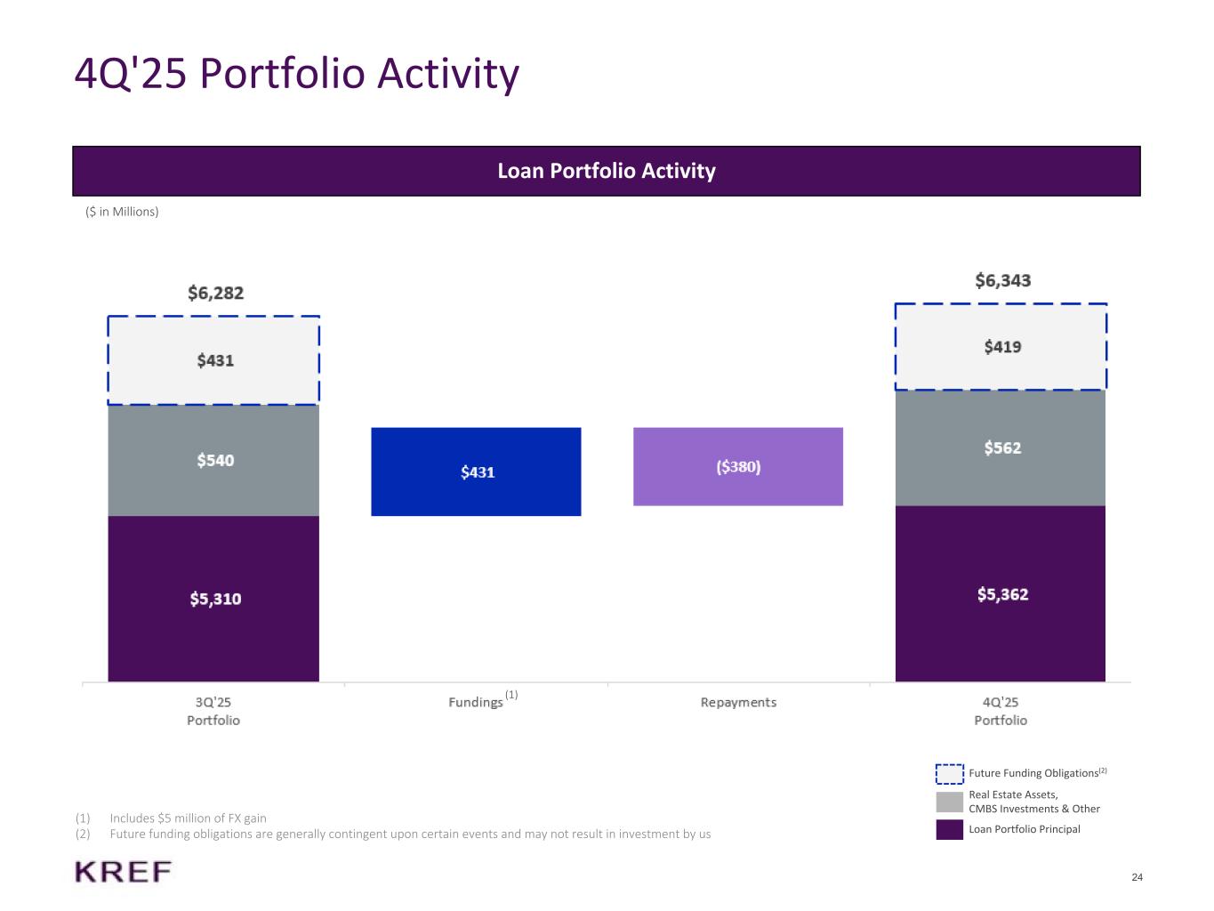 23 4Q'25 Portfolio Details (1) Our total portfolio represents the current principal amount or investment amount on senior and mezzanine loans, real estate assets, CMBS investments and other investments. Excludes loans that were fully written off. For Senior Loan 6, the total whole loan is on non-accrual and has an outstanding principal balance of $194.4 million, including (i) a fully funded senior mortgage loan of $120.0 million, at an interest rate of S+2.25% and (ii) a mezzanine note with a commitment of $79.4 million, of which $74.4 million was funded as of December 31, 2025, at a fixed interest rate of 4.5% PIK. (2) Total Whole Loan represents the total commitment of the entire loan originated, including participations by KKR affiliated entities. (3) Net equity reflects (i) the amortized cost basis of our loans, net of borrowings; (ii) real estate assets, net of borrowings and noncontrolling interests, and (iii) the investment amount of equity method investments, net of borrowings. (4) Weighted average is weighted by the current principal amount of our loans and the investment amount of CMBS investments. Weighted average LTV excludes risk-rated 5 loans and weighted average coupon excludes loans on nonaccrual status. (5) Coupon expressed as spread over Term SOFR, SONIA or EURIBOR. (6) Maximum remaining term (years) assumes all extension options are exercised, if applicable. (7) Loan Per SF / Unit / Key is based on the current principal amount divided by the current SF / Unit / Key. For Senior Loans 1, 2, 4, 10, 16 and 39, Loan Per SF / Unit / Key is calculated as the total commitment amount of the loan divided by the proposed SF / Unit / Key. (8) For senior loans, LTV is generally based on the initial loan amount divided by the as-is appraised value as of the date the loan was originated; for mezzanine loans, LTV is based on the initial balance of the whole loan divided by the as-is appraised value as of the date the loan was originated; for CMBS investments, LTV is based on the weighted average LTV of the underlying loan pool at issuance. Weighted Average LTV excludes risk-rated 5 loans. For Senior Loans 1, 2, 4, 10, 16 and 39, LTV is calculated as the total commitment amount of the loan divided by the as-stabilized value as of the date the loan was originated. (9) Represents real estate assets held through a Tenant-in-Common ("TIC") agreement between us and a KKR affiliate. We hold a 74.6% economic interest in the real estate assets and share decision- making with the KKR affiliate under the TIC agreement. (10) Represents our investment in an aggregator vehicle that invests in CMBS B-Pieces. Committed principal represents our total commitment to the aggregator vehicle whereas current principal represents the current funded amount. (11) Represents our 50% economic interest in an affiliated company, which is invested in a senior mortgage loan that is collateralized by industrial properties located in France. The underlying senior mortgage loan with an outstanding principal balance of €65.2 million, has a coupon of 2.8%, term to maturity of 2.8 years and LTV of 69%. The affiliated company's investment in the underlying senior mortgage loan is 80% financed with a funding cost of EURIBOR + 1.6%. KREF does not have unilateral authority to direct the activities that most significantly impact the affiliated company's economic performance.